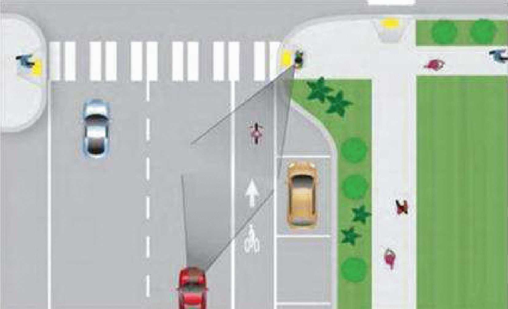 6.9. Припаркованные вблизи пешеходных переходов и выездов на дороге автомобили ограничивают видимость, что создает угрозу возникновения ДТП. Выступы бордюра на перекрестках и на пешеходных переходах на перегонах позволяют исключить ограничение видимости (рисунок 4.7).