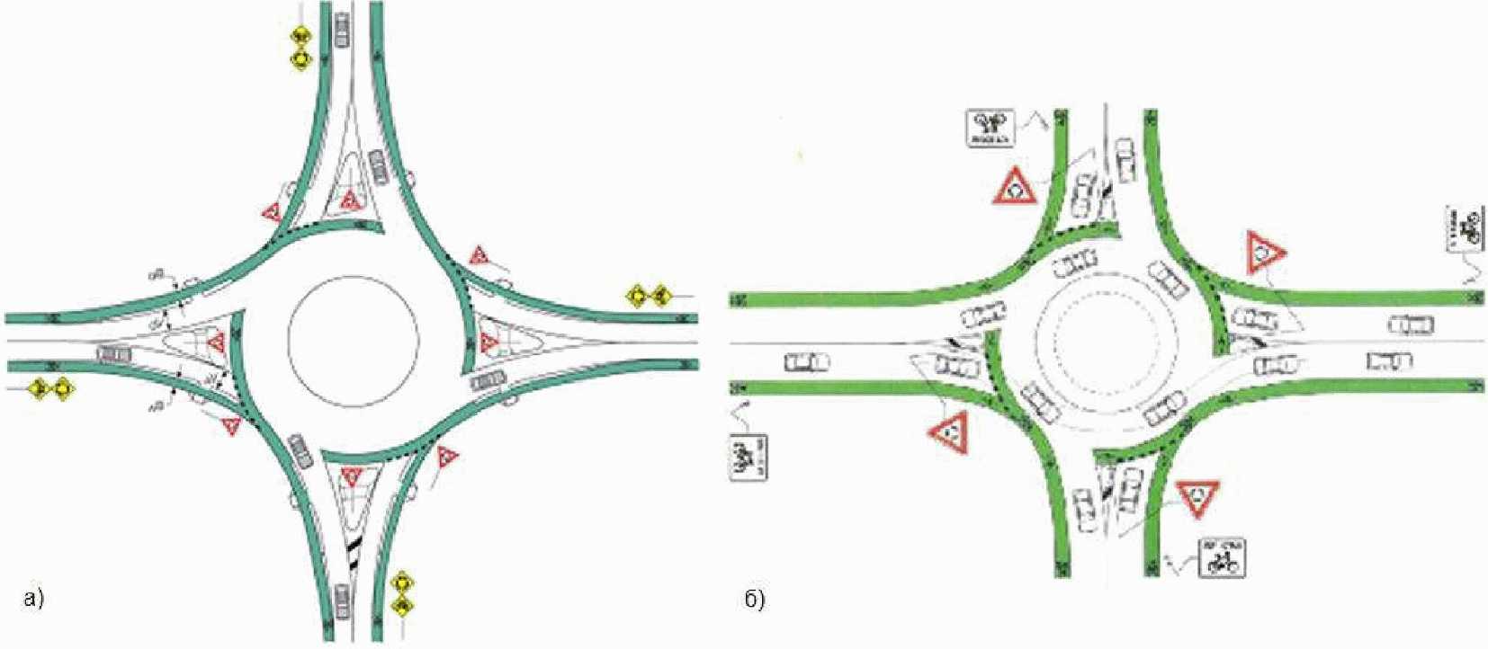 рисунок 4.4 а)) рекомендуется для случаев относительно высокой интенсивности движения и при средних скоростях движения. Велополоса на кольцевой проезжей части должна иметь контрастное по цвету покрытие и конструктивные элементы, отделяющие ее от проезжей части, предназначенной для автомобилей. Кроме того, устанавливаются дорожные знаки и наносится разметка, предупреждающие о присутствии велосипедистов. Островки перед въездом на кольцевое пересечение должны быть подняты в бордюре и иметь другие мероприятия, отделяющие велосипедистов от транспортного потока.