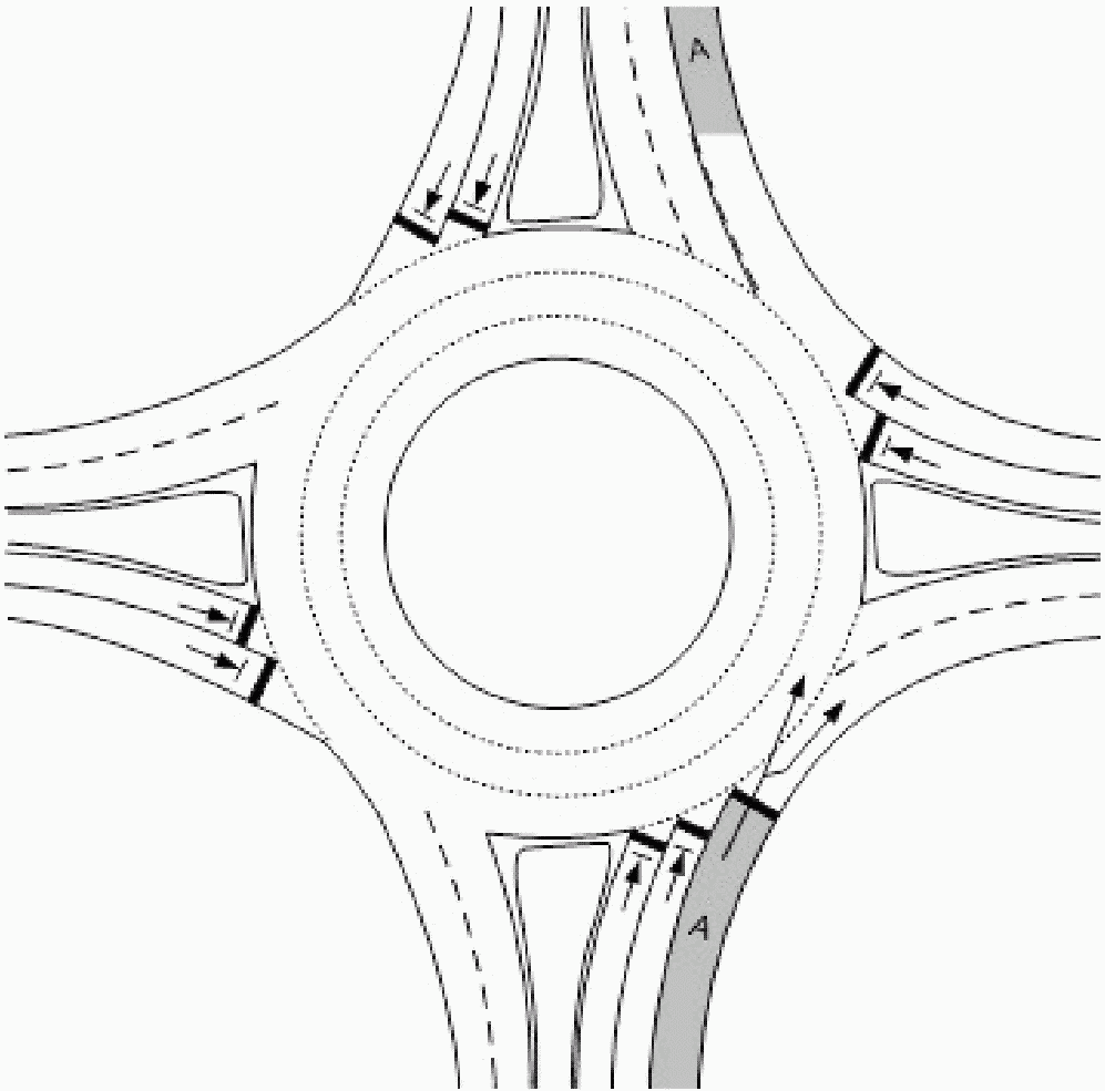 2.3. Во многих случаях в условиях сложившейся городской застройки или при ограничении в использовании земельных участков, в узлах со сложной планировкой организуют круговое движение относительно размещаемого центрального направляющего островка различной формы. Такие пересечения следует считать, как транспортные площади с круговым движением.