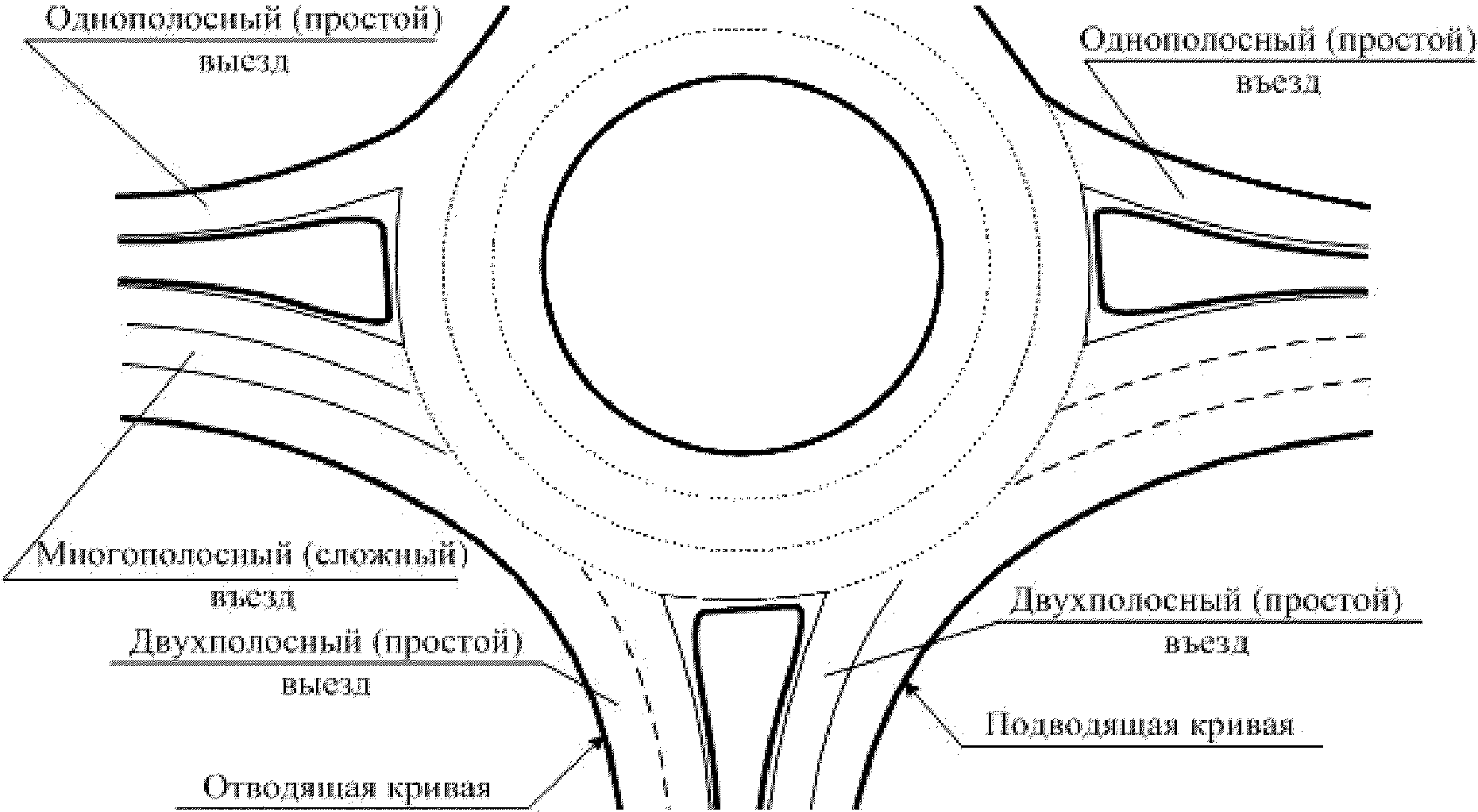 1.2. Тип кольцевого пересечения, конструкция и геометрические параметры в первую очередь определяются функциональным назначением узла, а также расчетными значениями интенсивности и скорости движения, обеспечения пропускной способности, требуемого уровня безопасности движения.