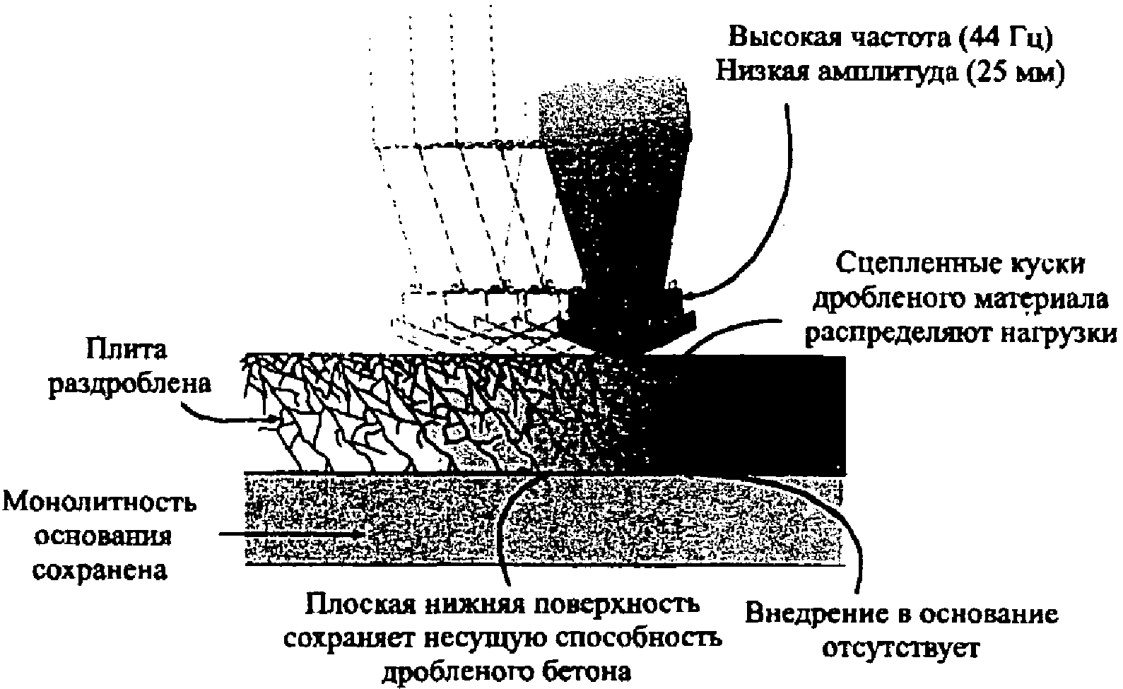 а) Деструктуризация цементобетонного покрытия выполняется автономным самоходным вибрационным бетоноломом. Машина обеспечивает нанесение низкоамплитудных (максимум 25 мм) ударов с силой не менее 8,9 кН по поверхности существующего цементобетонного покрытия при частоте не ниже 44 Гц.