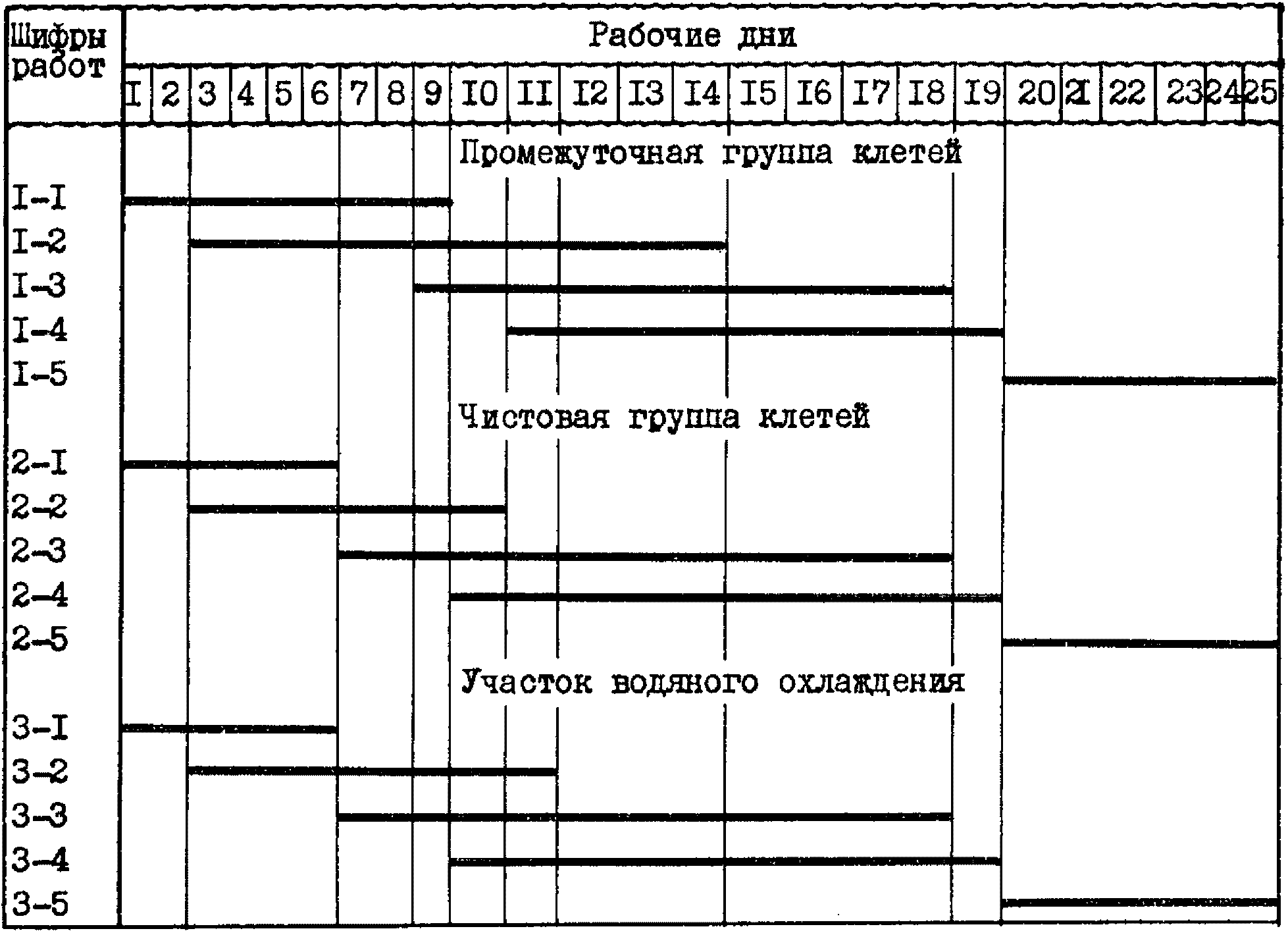 На следующем этапе производится выбор организационно-технологических решений по строительному производству, обеспечивающих необходимое сокращение базисной продолжительности остановочного периода реконструкции 3 и 4 ниток проката. В соответствии с проектом в остановочный период должны быть выполнены строительно-монтажные работы на трех участках: участке промежуточной группы клетей и участке чистовой группы клетей и участке водяного охлаждения. Данные по базисной продолжительности выполнения ведущих строительных процессов приведены в табл. 4