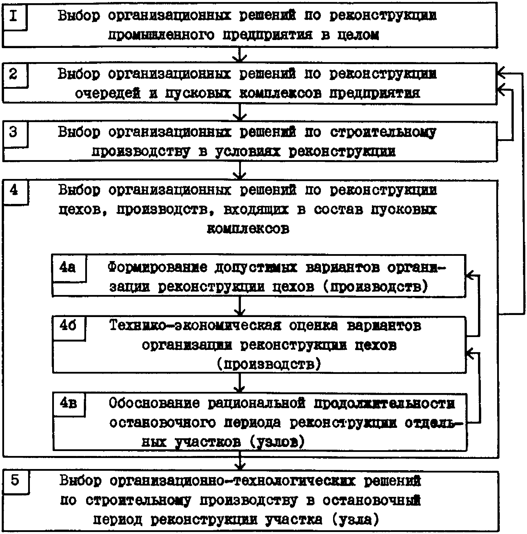 В зависимости от конкретных целей и задач реконструкции некоторые элементы приведенной схемы могут выпадать. Кроме того, количество возможных вариантов организации при реконструкции цехов или производств некоторых отраслей промышленности может быть очень ограниченным, что также сокращает объем проектных организационно-технологических проработок.