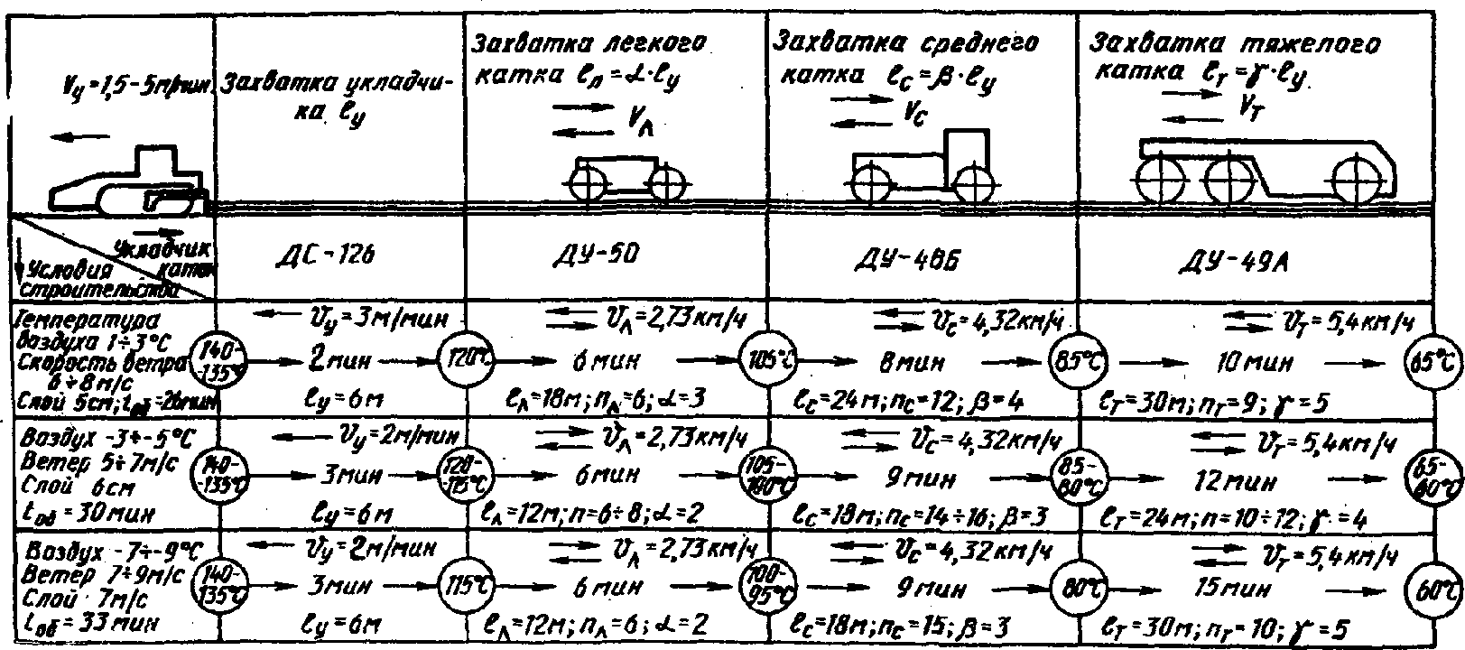 об = 24 - 26 мин (среднее 25 мин), которое можно распределить следующим образом: работа укладчика - 5 мин, среднего катка T-12 - 10 мин и тяжелого катка ДУ-49А - 10 мин.