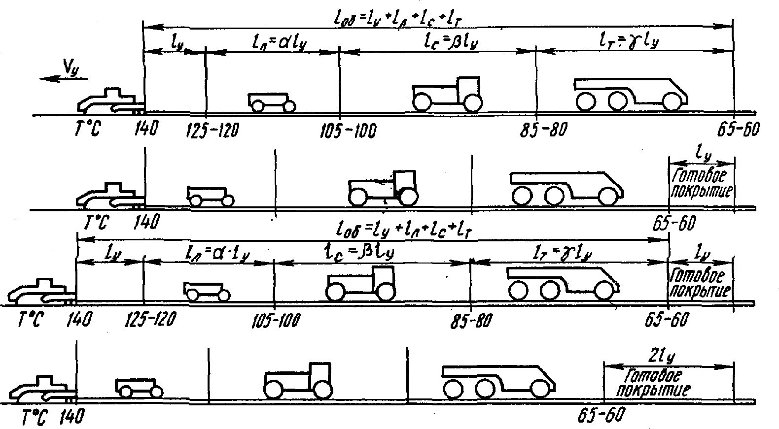 Длины захваток lу = 2,6 x 5 = 13 м; lс = 2,6 x 10 = 26 м; lт = 26 м; lоб = 13 + 26 + 26 = 65 м.