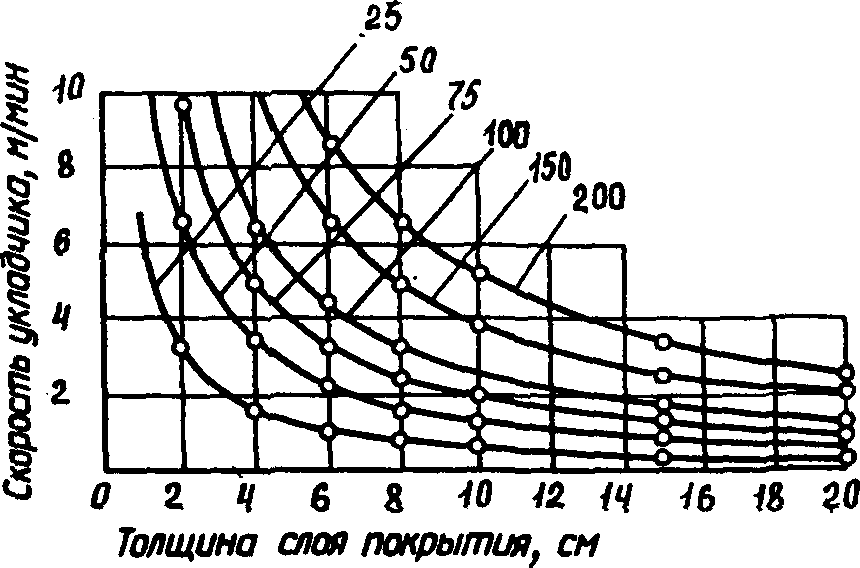 рис. 4 устанавливаем наибольшую скорость укладчика, соответствующую заданной производительности АБЗ 50 т/ч. При толщине слоя покрытия 7 см смесь будет поступать к месту укладки непрерывно, т.е. укладчик будет двигаться без остановок. Поэтому v
