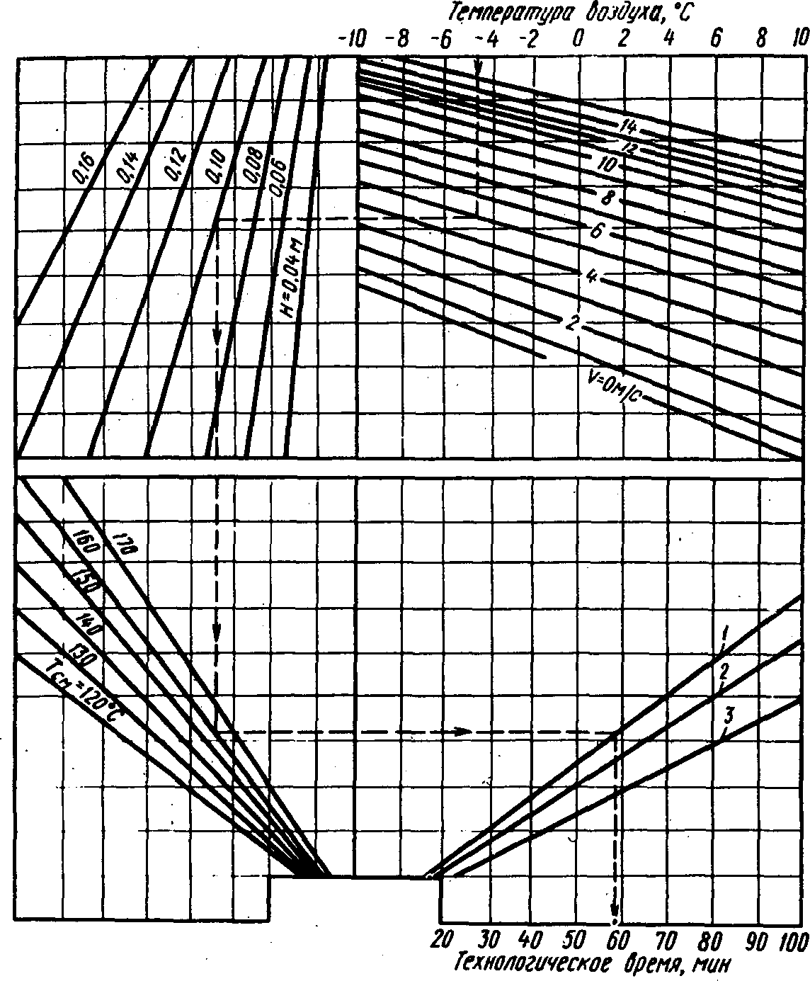 Пример 2. Температура воздуха 1 - 3 °C, скорость ветра не более 1 м/с; толщина слоя смеси типа Б в покрытии 5 см. Используется укладчик C-750 (ГДР), раскладывающий смесь шириной 4,5 м и обеспечивающий за счет работы своих брусьев предварительное уплотнение до Kу = 0,93. Для последующей укатки на основном этапе можно использовать виброкаток T-12 (ГДР) или комбинированный каток K-12 (ГДР), а на заключительной стадии - статический гладковальцовый каток ДУ-49А.