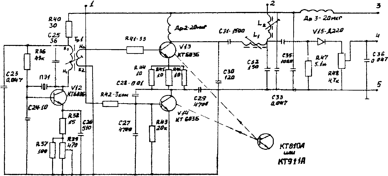(рис. 4) на транзисторы большой мощности типа КТ-610А (КТ911А), это позволило без внесения существенных изменений и дополнительной подстройки увеличить выходную мощность передатчика, при которой дальность действия системы увеличилась на 30%.