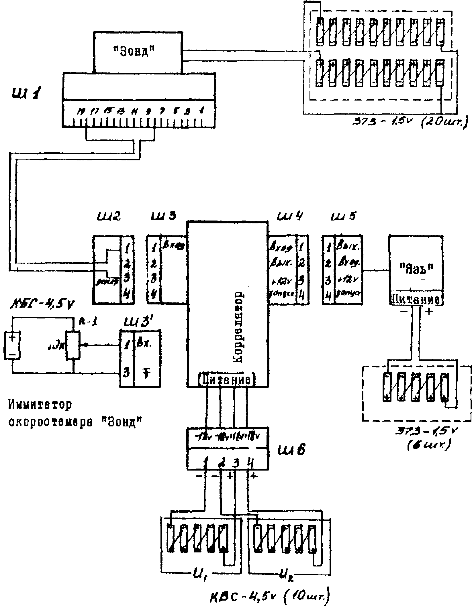 2.3. Рабочее напряжение скоростемера обеспечивают двумя комплектами по 10 сухих элементов на 1,5 В, соединяемых параллельно. Полученное напряжение стабилизируется блоком СН-12.6. Подаваемое напряжение контролируют по показаниям миллиамперметра блока питания. Для удовлетворительной работы скоростемера стрелка прибора должна показывать не менее 4 мА.