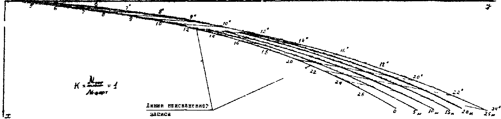 При этом горизонтальные линии палетки (ось y) должны быть параллельны нулевой линии батиграммы на прозрачной бумаге. После этого концы дешифрируемого отрезка записи переносят по линиям сдвига, обозначенными цифрами градусов на палетке на линию неискаженной записи, обозначенную глубиной "O" и прочерчивают на прозрачной бумаге действительное положение отрезка.