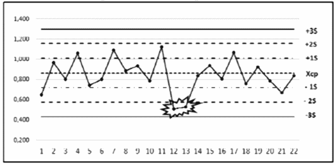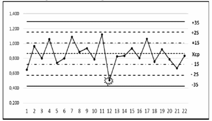 2 | Карта 2 | Правило Вестгарда 13S | Результат одного измерения находится за пределами (+3S) или (-3S) от среднего значения контроля (Xср). Правило Вестгарда 13S предупреждает о наличии недопустимой случайной ошибки или начале большой систематической ошибки (сдвиг) | Отбраковать аналитическую серию, проверить работу оборудования, работу оператора, валидацию внутри тестовых контролей и осуществить повторную постановку |