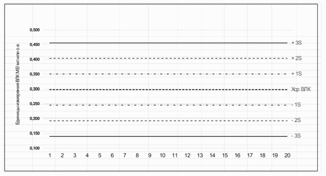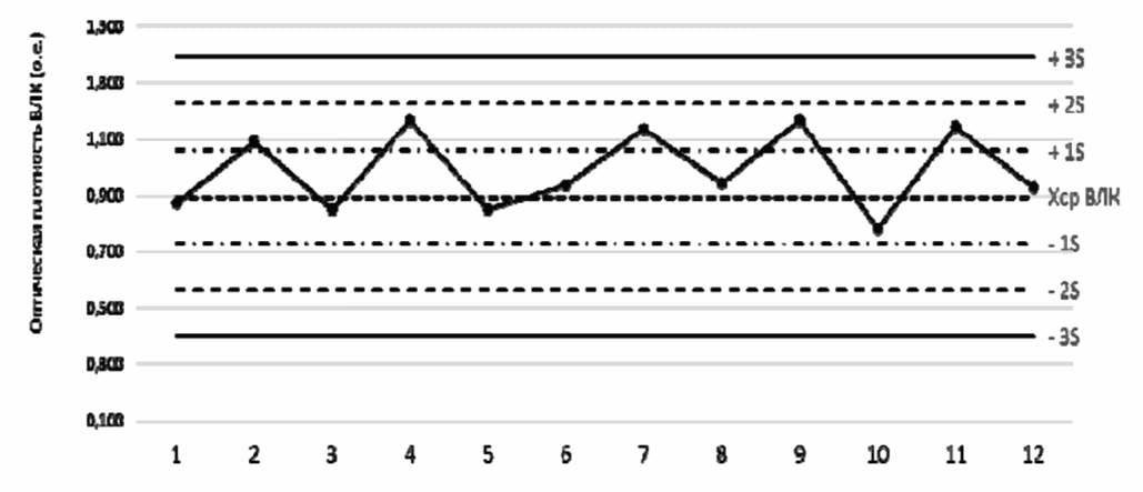 Примечание: ось ординат (Y) - результаты тестирования контрольного препарата при каждом эксперименте; ось абсцисс (X) - номер опыта (в реальном режиме следует ставить дату проведения эксперимента).