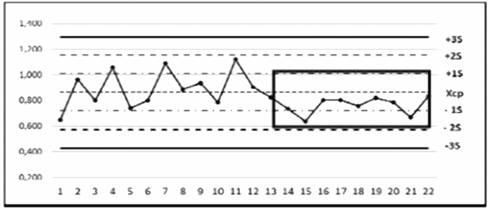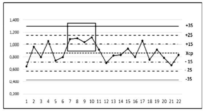 4 | Карта 4 | Правило Вестгарда 41S | Результаты последовательных четырех измерений находятся по одну сторону за пределами (+1S) или (-1S) от среднего значения контроля (Xср). Правило Вестгарда 41S предупреждает о наличии систематической ошибки | При нарушении правила 41S необязательно отменять полученные результаты и проводить повторное измерение. Правило Вестгарда 41S выявляет небольшие систематические ошибки (смещение или дрейф). Такие ошибки могут быть устранены при технической проверке оборудования, проведении инструктажа для оператора, проверке валидации внутри тестовых контролей |