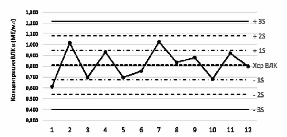 2.11. Построенные контрольные карты использовать для осуществления оперативного (текущего) контроля качества результатов исследования образцов на предмет выявления IgG-антител к вирусу кори методом ИФА. С этой целью в каждой аналитической серии в одной лунке исследовать препарат ВКП-IgG, который подвергается всем процедурам, предусмотренным инструкцией для исследуемых образцов, и измерить показатель оптической плотности (качественная оценка) или рассчитать концентрацию ВЛК (количественная оценка результатов). Полученные результаты нанести на контрольную карту с указанием даты постановки вручную или используя стандартный пакет программ.