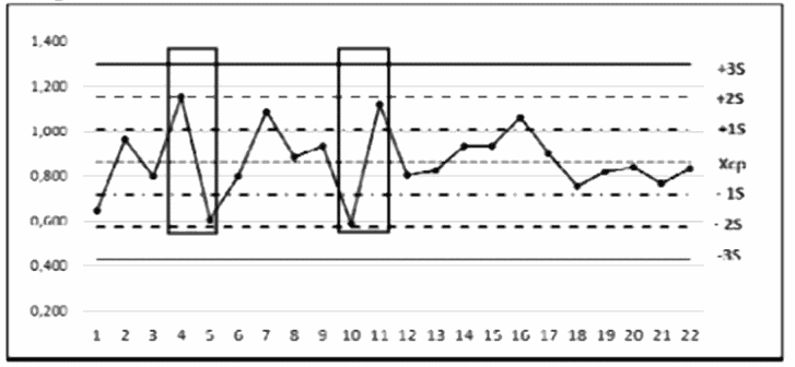 3 | Карта 3 | Правило Вестгарда R4S/1* | 1 вариант. Результат одного измерения (точка 5) находится на расстоянии >= 4S от предыдущего измерения (точка 4). 2 вариант. Результат одного измерения (точка 11) находится на расстоянии >= 4S от предыдущего измерения (точка 10). Правило Вестгарда R4S предупреждает о наличии случайной ошибки | Проверить работу оборудования, работу оператора, валидацию внутри тестовых контролей. 1 вариант. Если измерение (точка 5) >= (-2S), а предыдущее значение (точка 4) >= (+2S), то осуществляем перестановку отрицательных результатов, которые попали в интервал (ОПкр. - 20%). 2 вариант. Если последнее измерение (точка 11) >= (+2S), а предыдущее значение (точка 10) >= (-2S), то осуществляем перестановку положительных результатов, которые попали в интервал (ОПкр. + 20%) [18] |