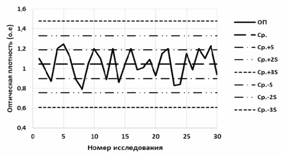 3.1. При проведении неколичественными методами ИФА каждой серии лабораторных исследований по определению противокоревых антител с помощью ИФА рекомендуется выполнять контрольные измерения, отображать их результаты на контрольных картах Леви-Дженнингса и на основании полученных данных принимать решение о степени достоверности полученных результатов