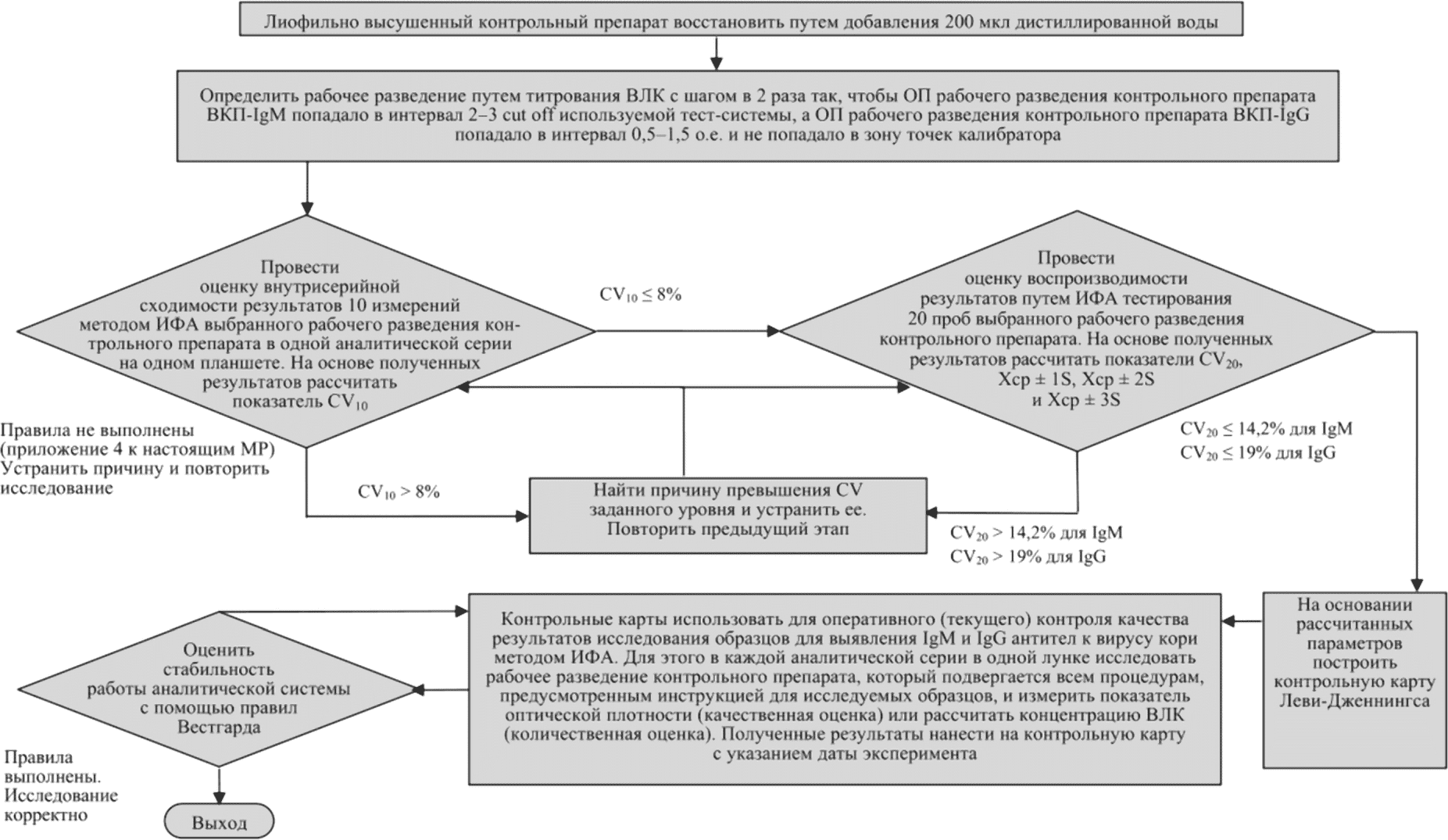 1.2. В МР использована система ВКК, позволяющая определять достоверность получаемых результатов и анализировать с помощью карты Леви-Дженнингса данные, полученные при обследовании больных и переболевших корью, а также привитых против этой инфекции. Алгоритм может применяться при использовании различных контрольных препаратов: