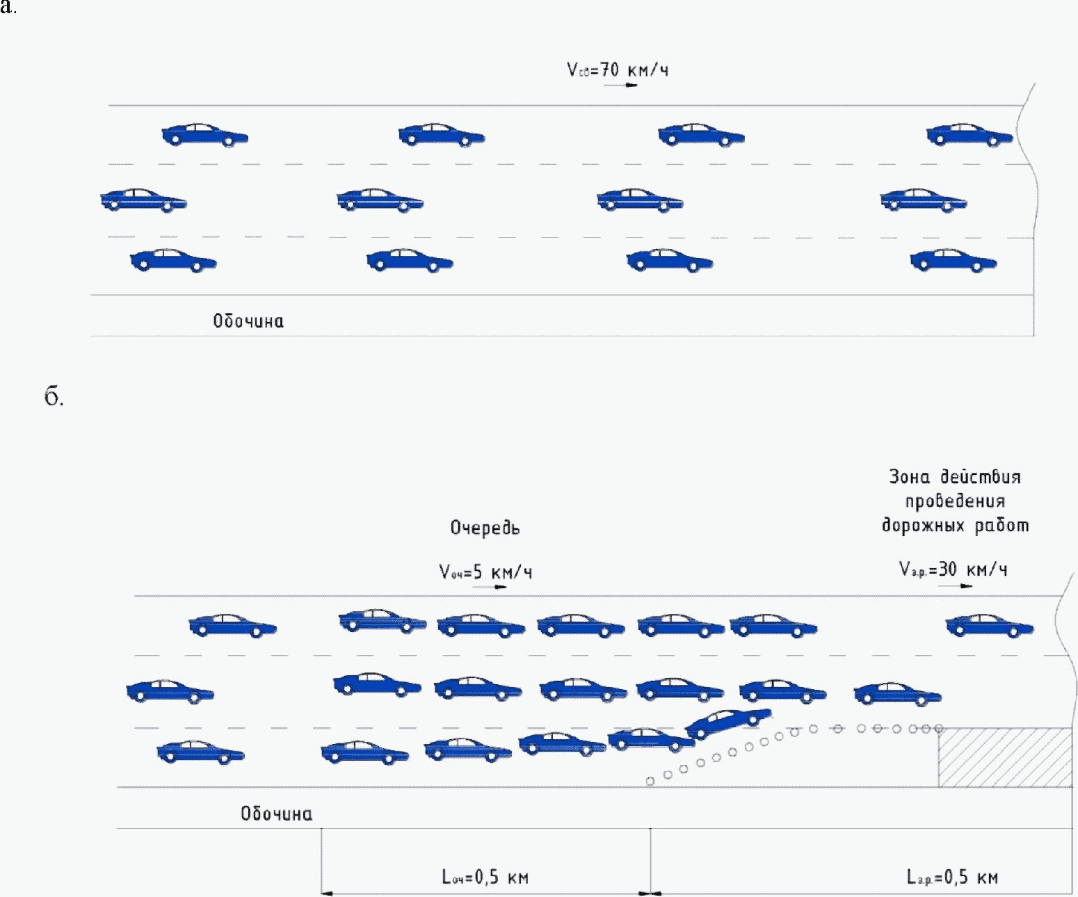 - учет особенностей движения транспортных потоков в период проведения ремонтно-восстановительных воздействий на конструкциях дорожных одежд, в том числе: а) с перерывами и б) без перерывов в движении автомобилей при выполнении дорожных работ;
