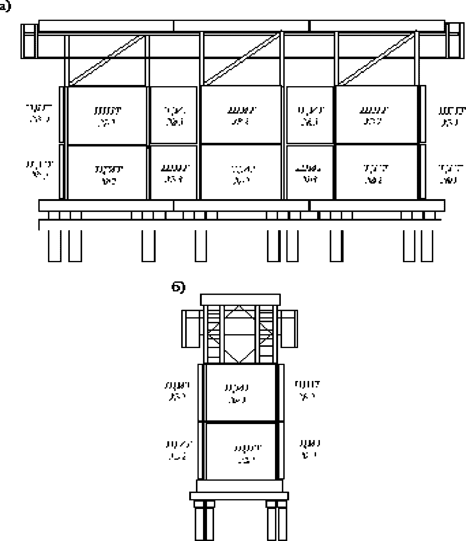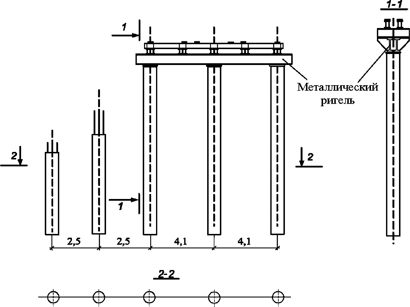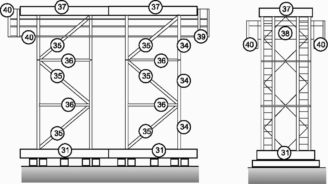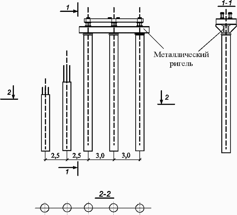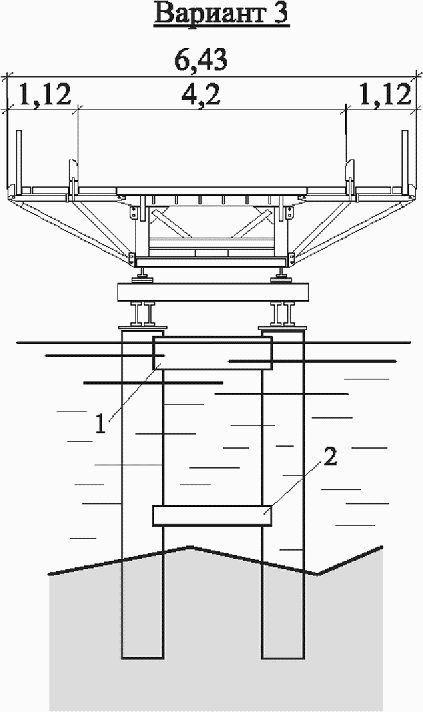5.3.1 Промежуточные опоры представляют собой конструкцию башенного типа, собранную для запроектированного габарита 4,2 или 7,2 м, на свайном фундаменте или естественном основании. Сваи забиваются до расчетной нагрузки на глубину не менее 4 м от линии наибольшего размыва, возможного на период эксплуатации моста.