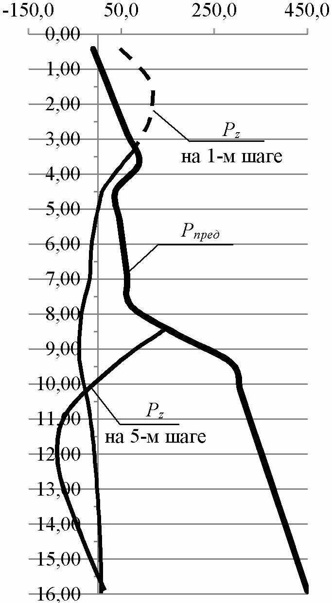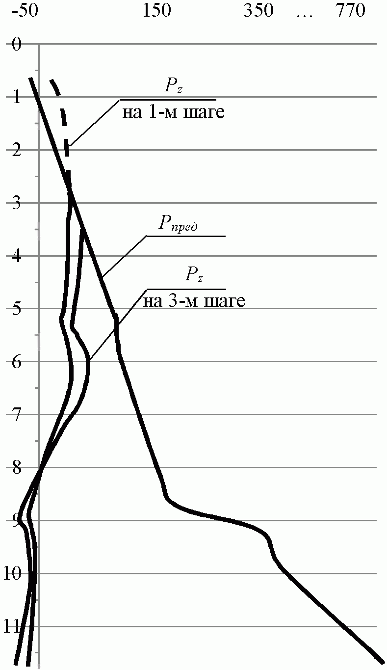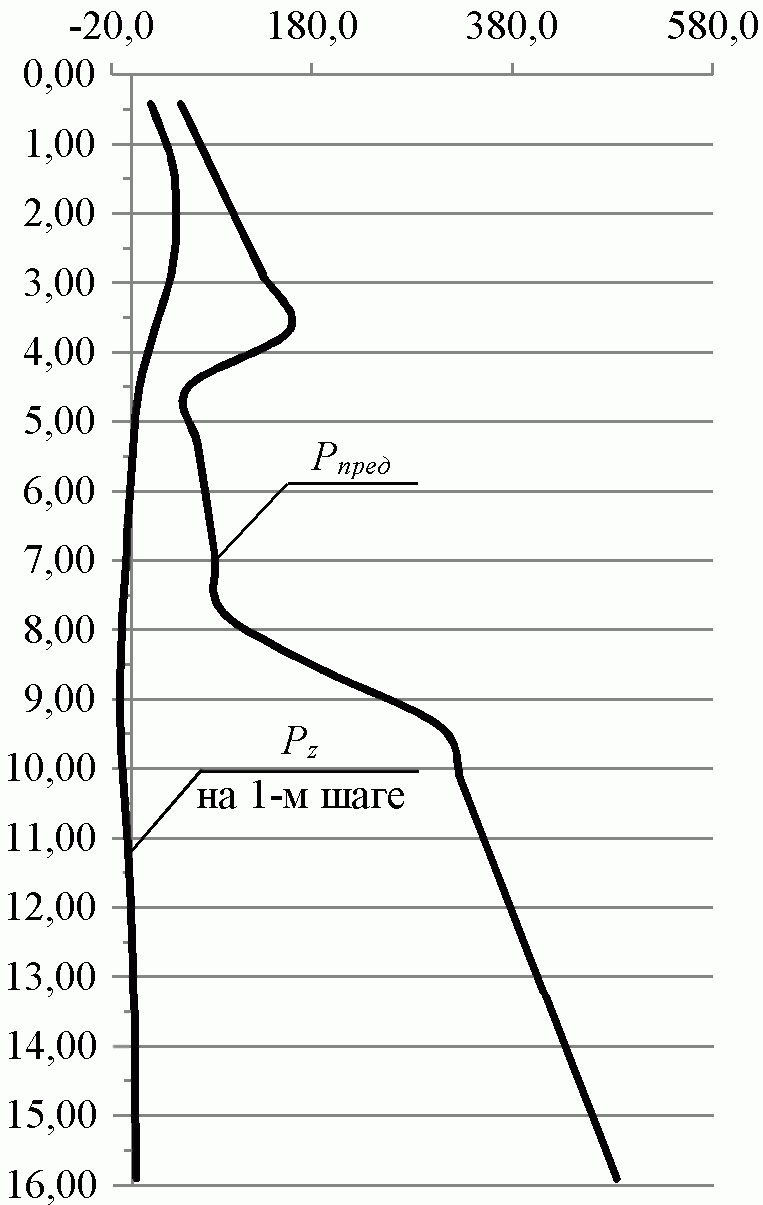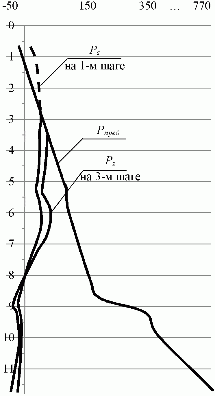 Расчет по перемещениям был закончен на третьем шаге, так как было получено соотношение Pzi < Pпред,i = (pпi - pаi) x 1 м (рисунок В15). Горизонтальное перемещение верхнего конца ШТС составило 13 мм.