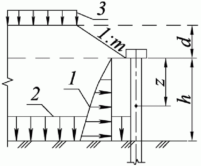 3.1 активное и пассивное давление грунта на стенку: Виды давления грунта засыпки на стенку (в том числе подпорную стенку шпунтового типа), формирующиеся при перемещении стенки в сторону от засыпки (а. д.) и в сторону засыпки (п. д.). А. и п. д. соответствуют состоянию предельного равновесия грунтовой среды в соответствии законом Кулона и уравнением Мора-Кулона.