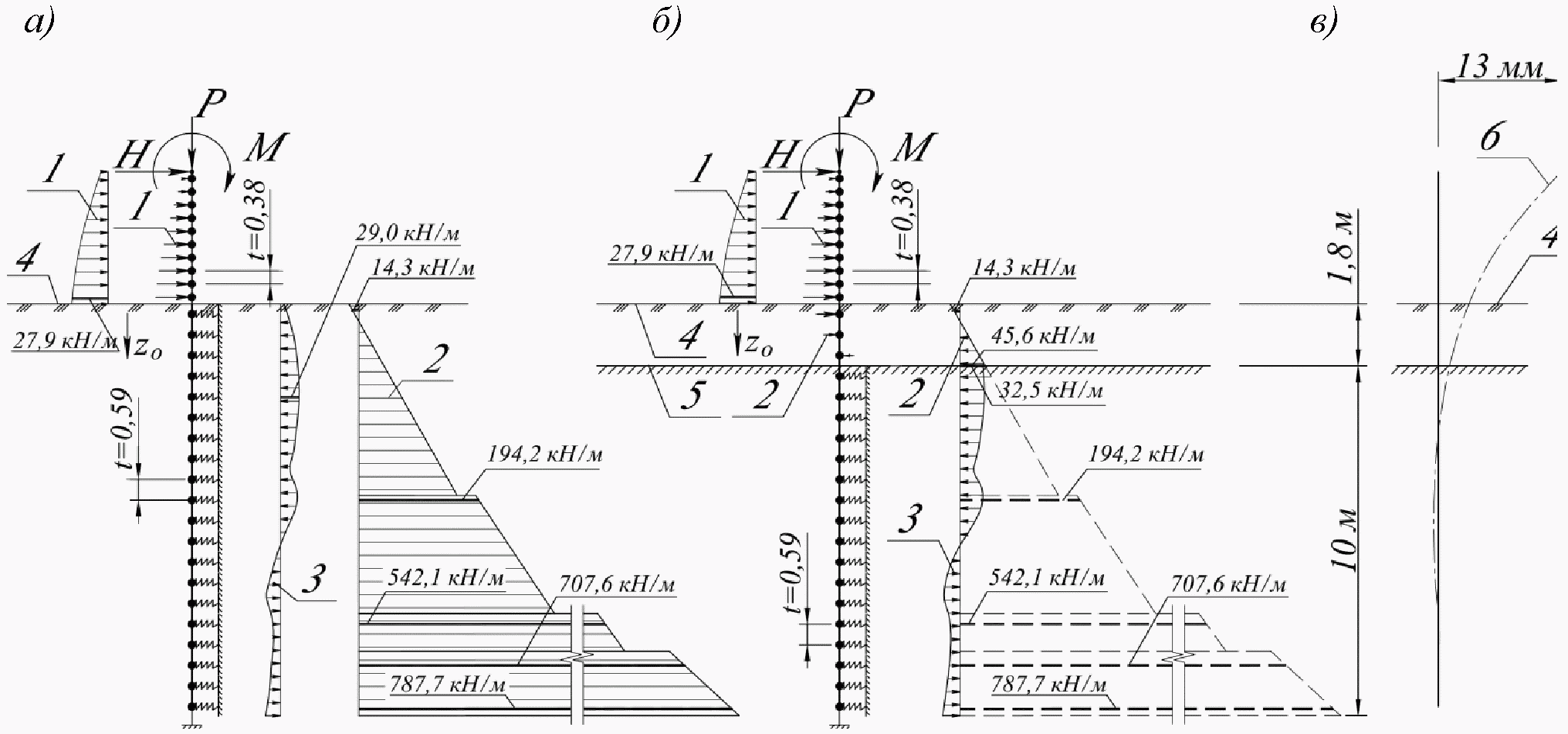 Граница защемления, определилась на уровне 3,0 м от планировочной поверхности и 9,8 м от нижнего конца ШТС. Горизонтальное перемещение верхнего конца ШТС составило 20 мм, угол поворота - 2,2 x 10