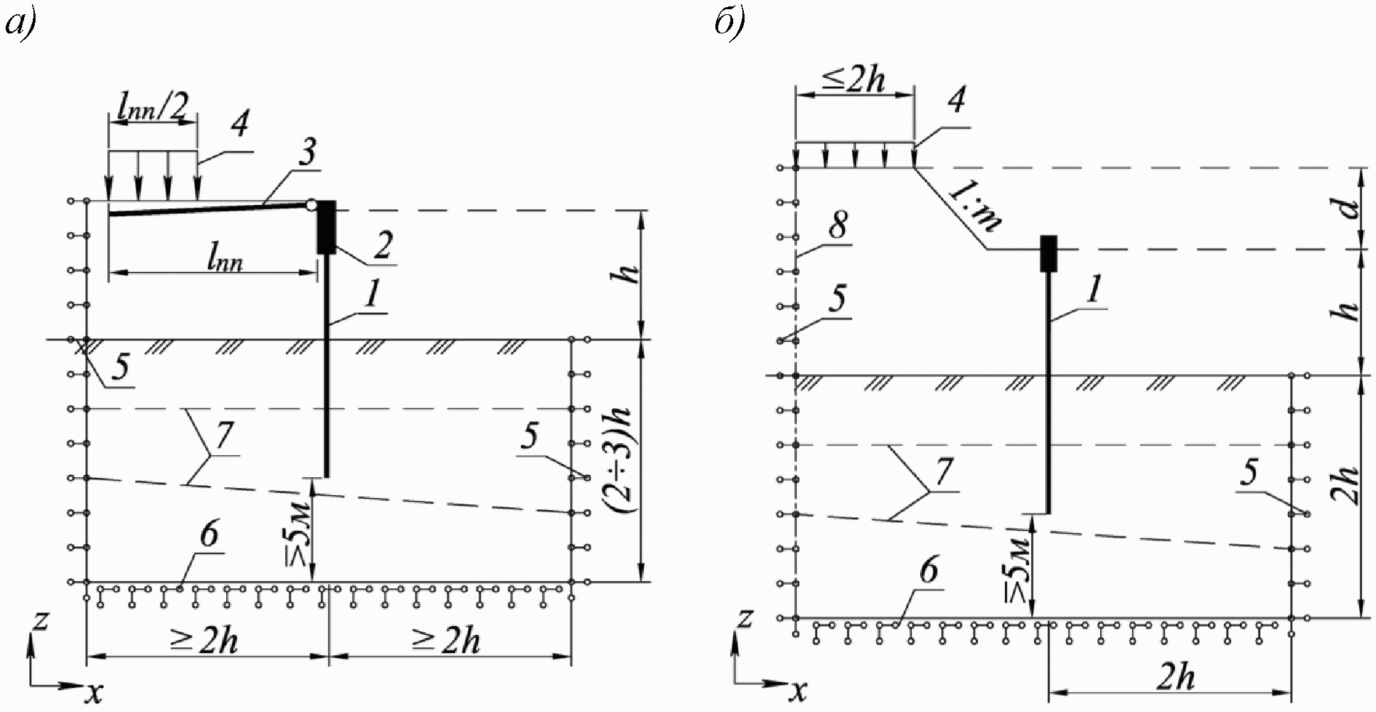 Задача расчета решается как плоская (плоская деформация). Форма и размеры расчетной области, граничные условия принимаются в соответствии со схемой на рисунком Г1. Размеры расчетной области определяются в зависимости от высоты h засыпки за устоем или высоты дорожной подпорной стенки. На контакте шпунтовой стенки и грунта засыпки учитываются только горизонтальные связи (неразрывность по горизонтали) и не учитываются вертикальные связи. На контакте грунта и заглубленной части шпунтовой стенки учитываются горизонтальные связи, а вертикальные связи - в размере, не превышающем сопротивление грунта основания по боковой поверхности ШТС. Вертикальная связь нижнего конца шпунтовой стенки с основанием неразрывная.