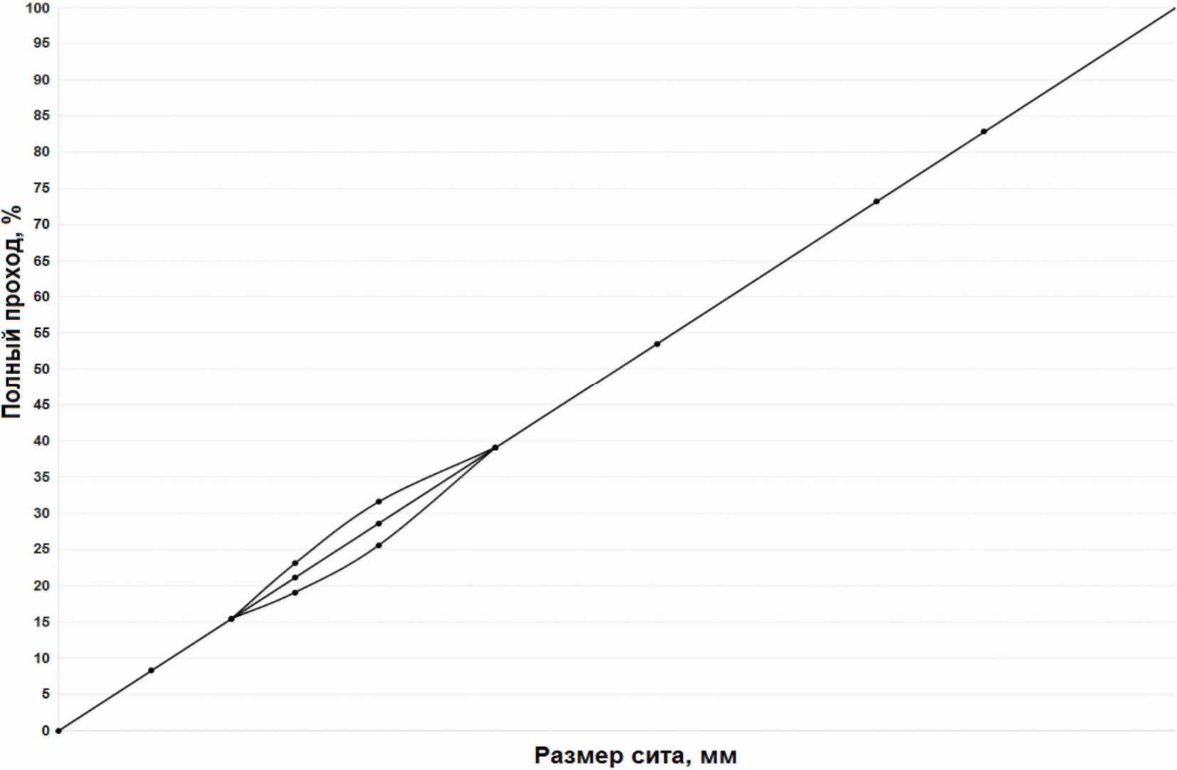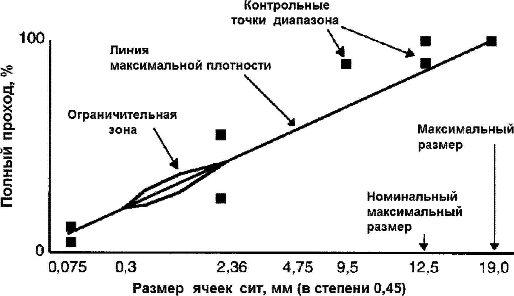 - график зернового состава минеральной части с иллюстрацией линии максимальной плотности, ограничительной зоны и кривых нормированного диапазона по контрольным точкам;