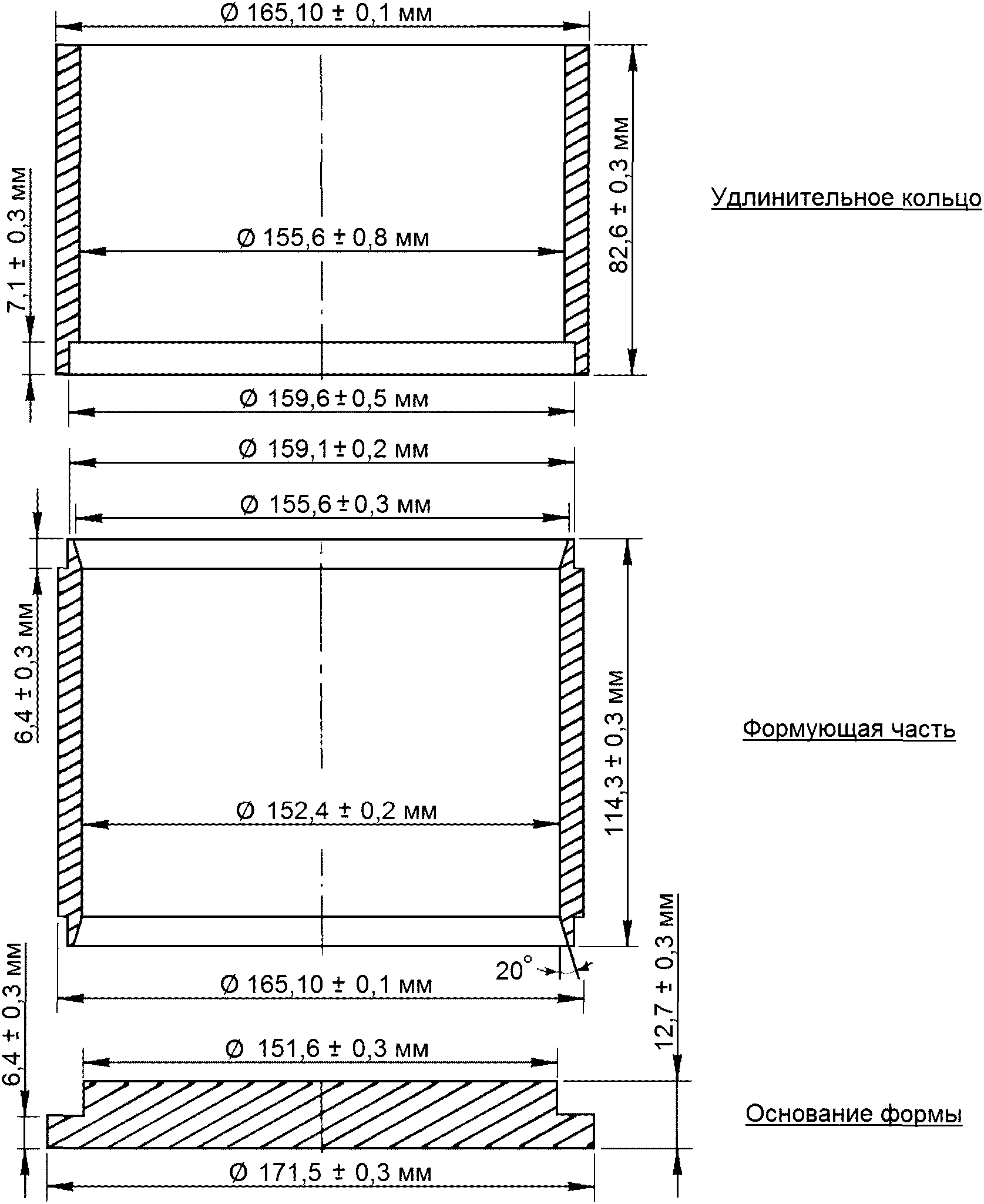 5.1 Форма для образцов в сборе - форма представляет собой металлический цилиндр, с наружным диаметром 165,1 +/- 0,2 мм, с внутренним диаметром 152,4 +/- 0,2 мм и длиной 114,3 +/- 0,3 мм, основание формы и удлинительное кольцо, должны соответствовать требованиям, указанным на рисунке 2.