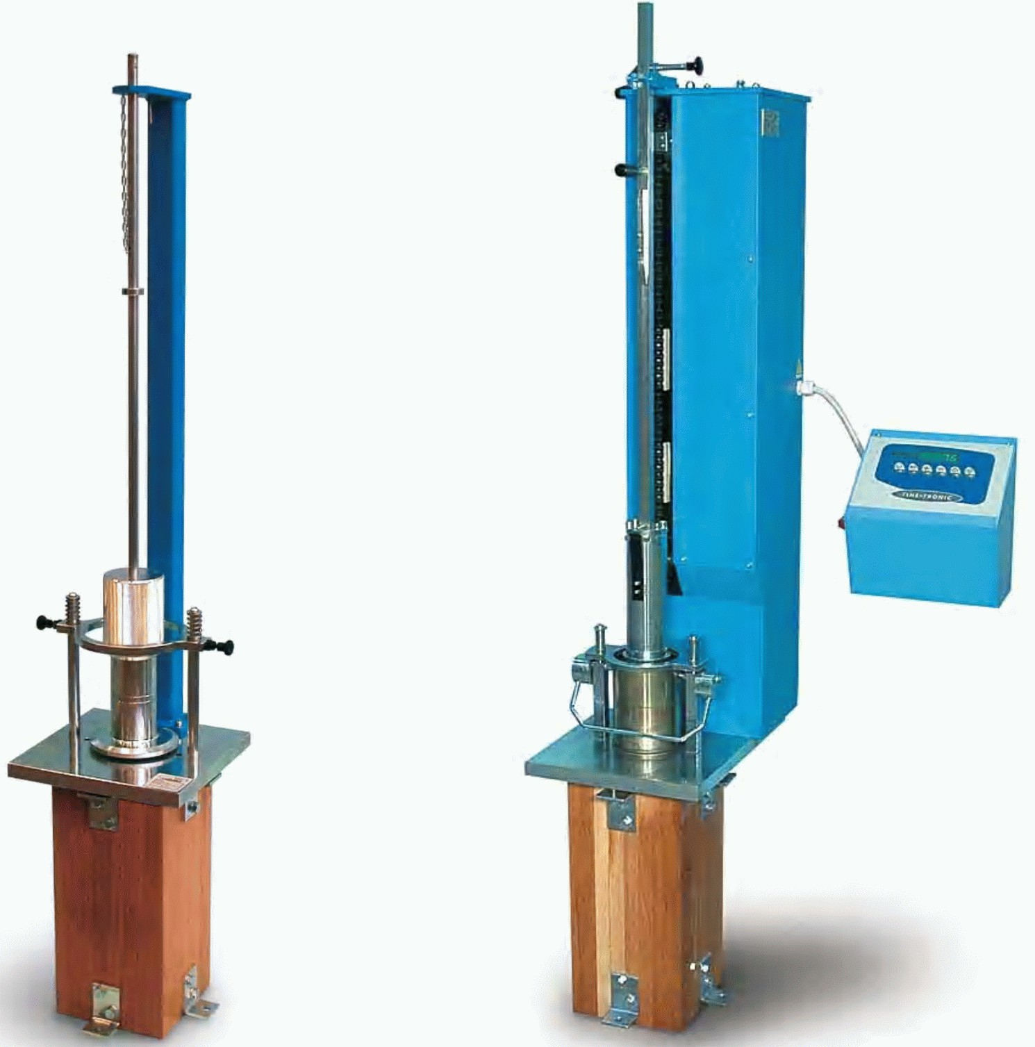 5.3 Механический уплотнитель - Уплотнение образцов может производится либо ручным уплотнителем, либо механическим (см. рисунок 3). Механический уплотнитель должен быть оснащен двигателем с минимальной мощностью 250 Вт, цепным подъемником, рамой и устройством автоматического спуска подвижного груза. Серия образцов одного исследования должна быть уплотнена оборудованием одного типа.