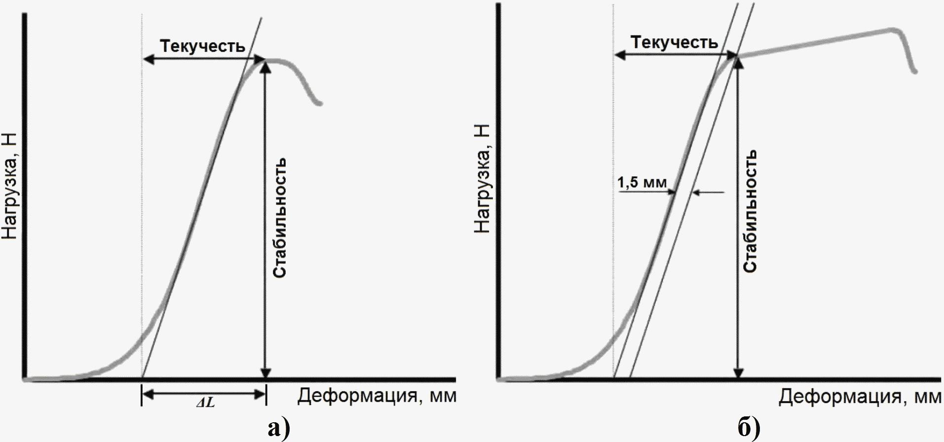 На кривой, окончание участка текучести по Маршаллу FM обычно соответствует точке максимального значения нагрузки (см. рисунок 8, а), однако, в некоторых случаях, кривая не заканчивается характерной пиковой точкой, в связи с чем достаточно сложно четко найти расчетную точку, поэтому на кривой расчетная точка определяется через 1,5 мм справа от касательной линии, как показано на рисунке 8, б).