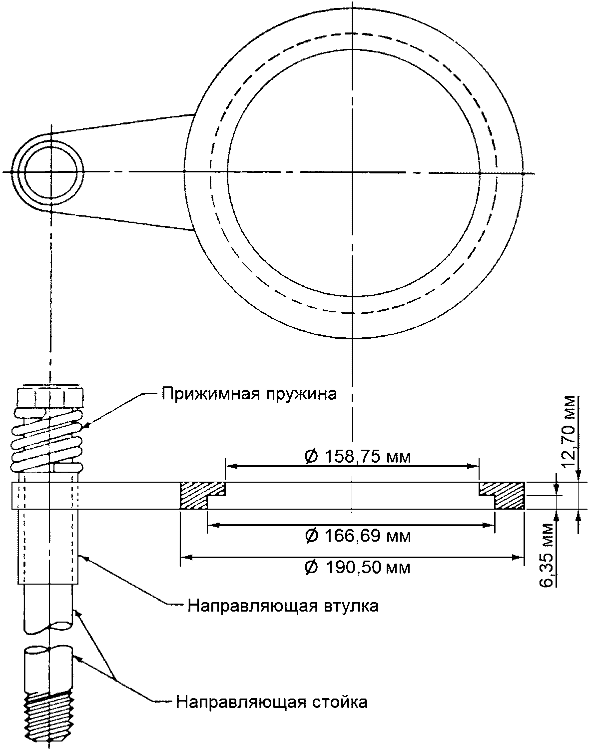 5.2 Устройство для извлечения образцов - стальной диск диаметром от 151,1 до 152,1 мм и толщиной 12,7 +/- 0,3 мм для извлечения уплотненных образцов из формы при помощи удлинительного кольца формы. Для передачи нагрузки от адаптера кольцевого динамометра к удлинительному кольцу при извлечении образца требуется соответствующая рейка.