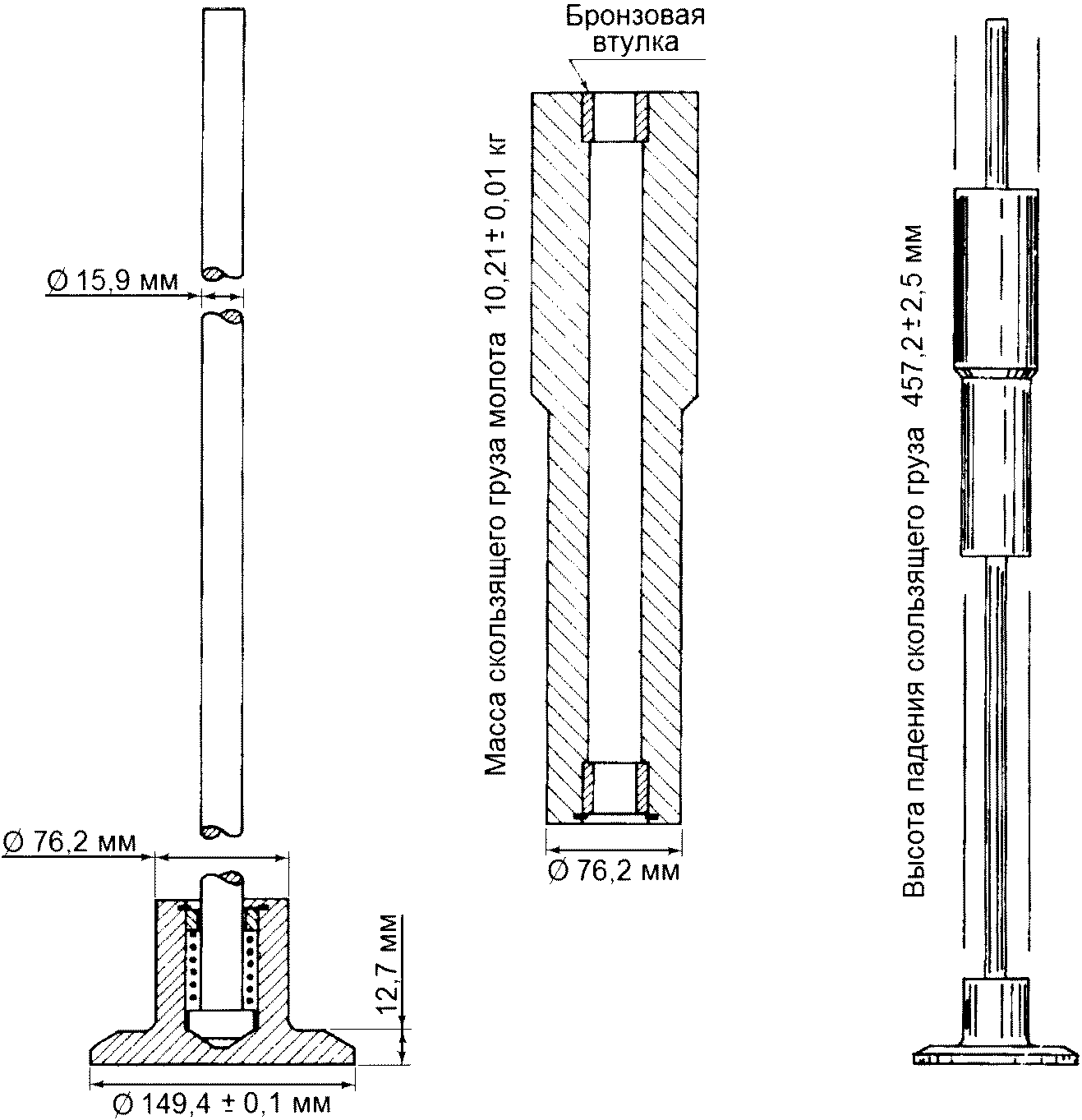 5.4 Уплотнительный молот (см. рисунок 4) должен иметь плоскую круглую трамбовочную головку диаметром 149,4 +/- 0,1 мм. Подвижный вес при свободном падении с высоты 457,2 +/- 2,5 мм должен составлять 10,21 +/- 0,01 кг. Рекомендуется использовать два уплотнительных молота.