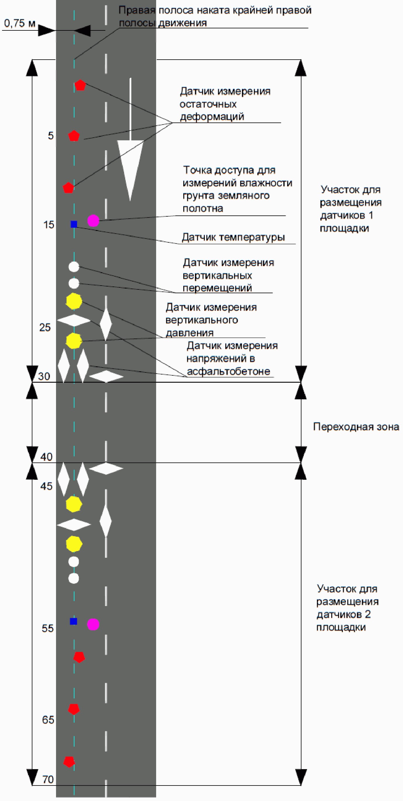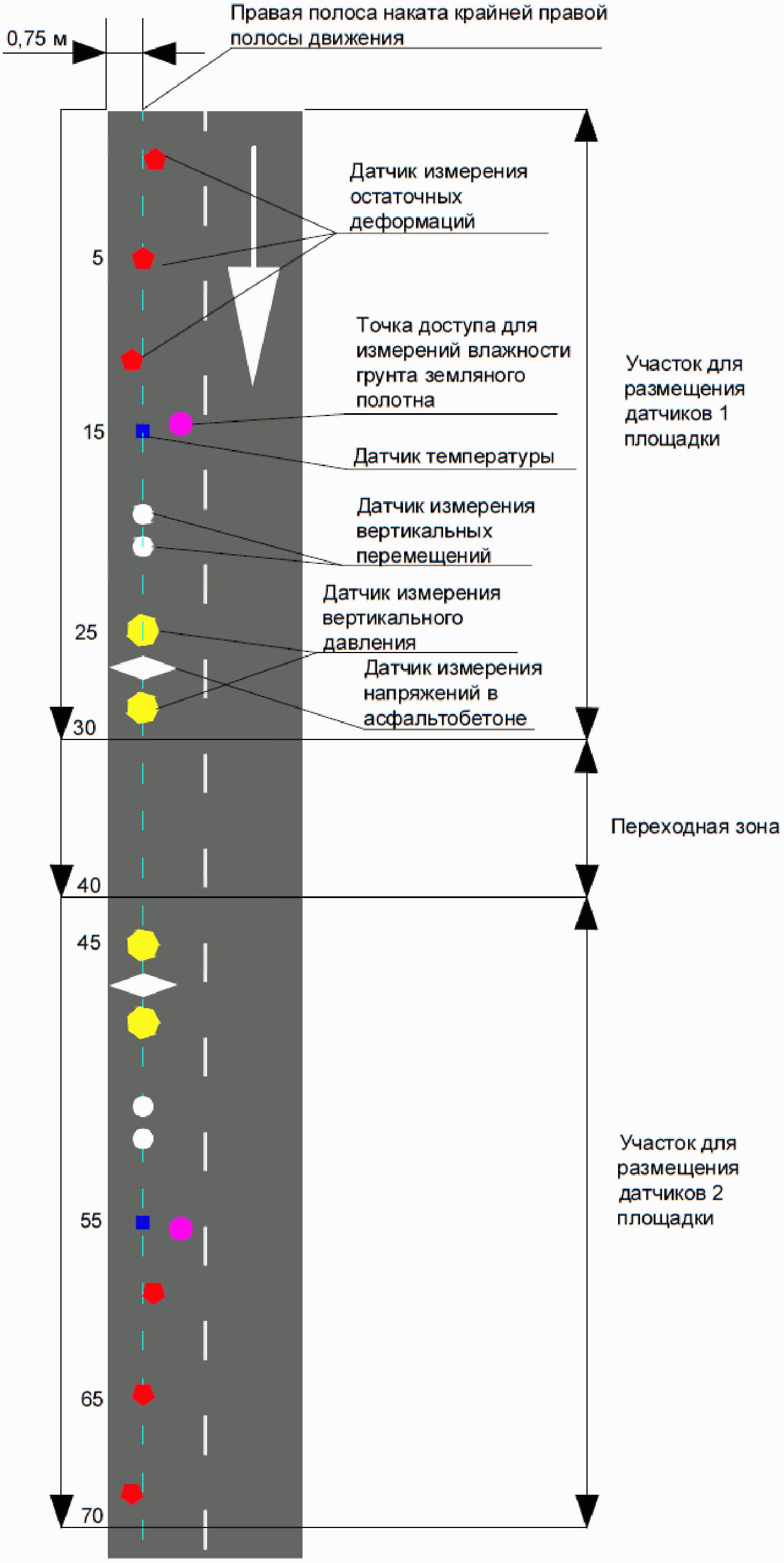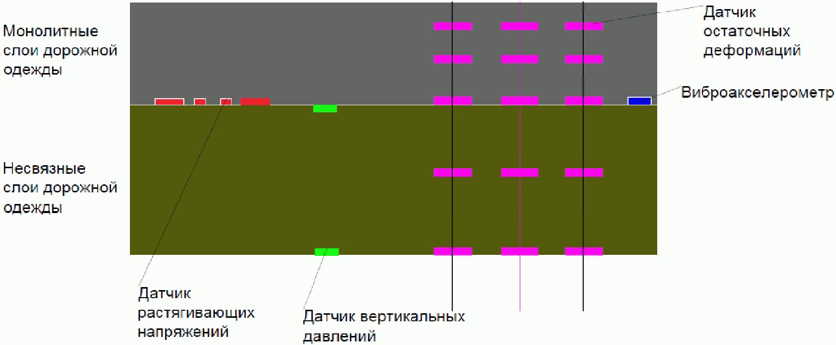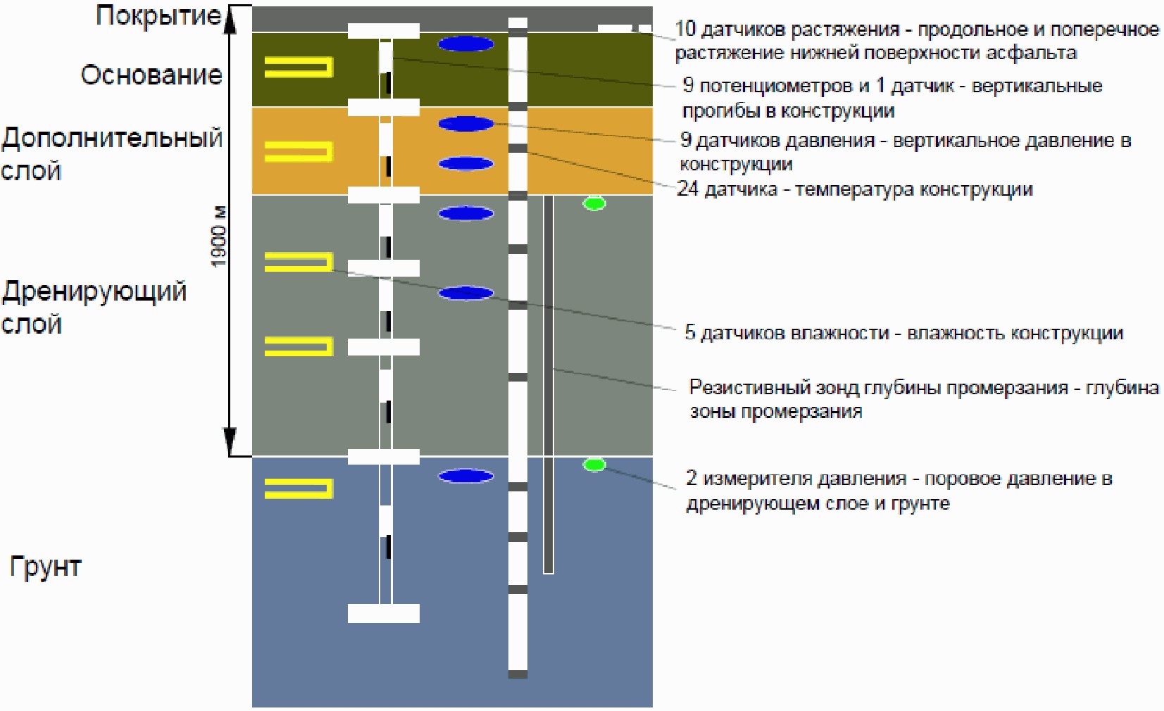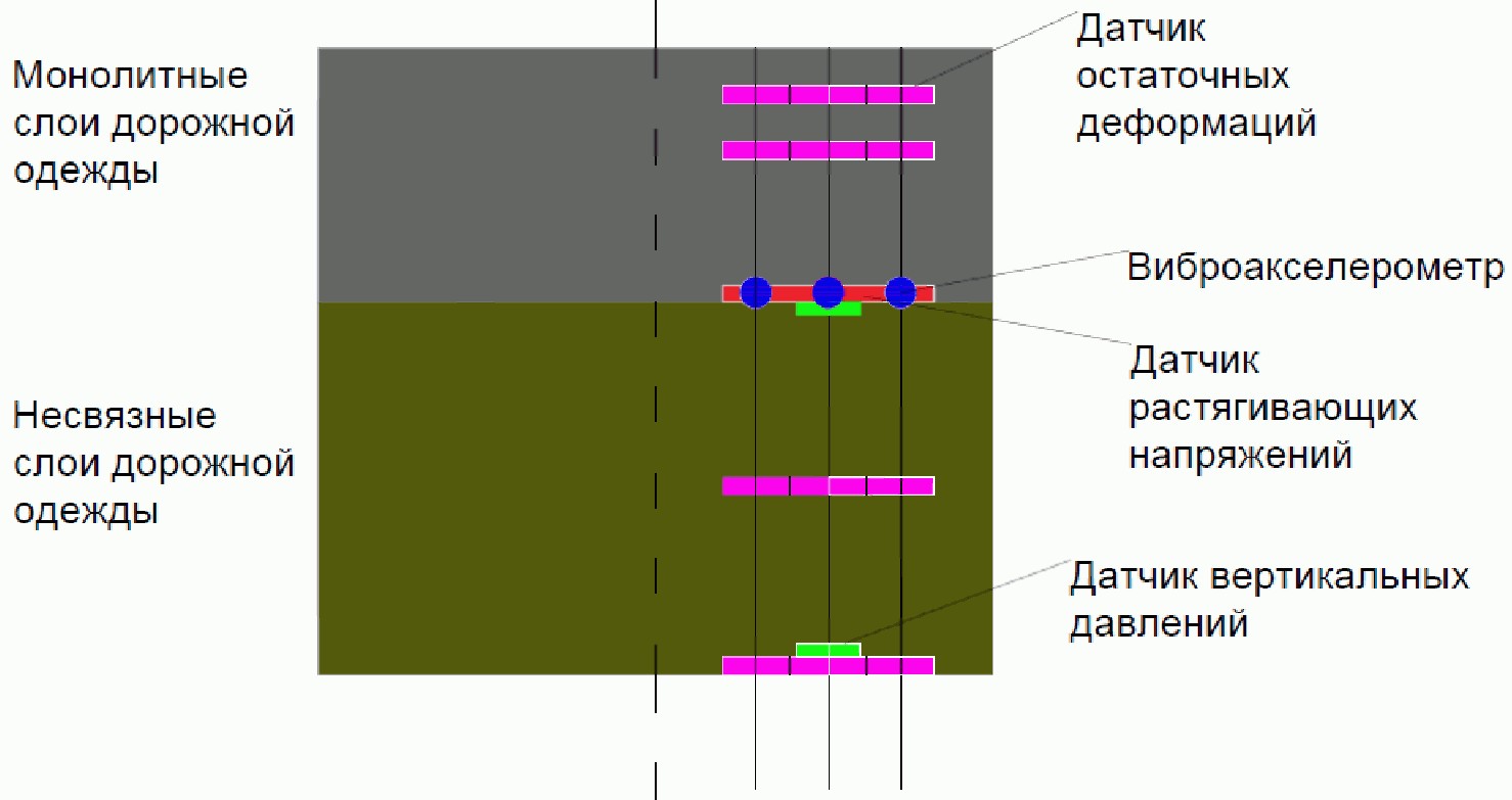 5.12 Минимальный набор датчиков и приборов, устанавливаемых в конструкции, должен включать датчики: остаточных и обратимых деформаций, оценки внутренних напряжений в асфальтобетоне (в цементобетоне), оценки внутренних напряжений, температуры, влажности грунта, а также виброакселерометр, зонд глубины промерзания, датчики порового давления.