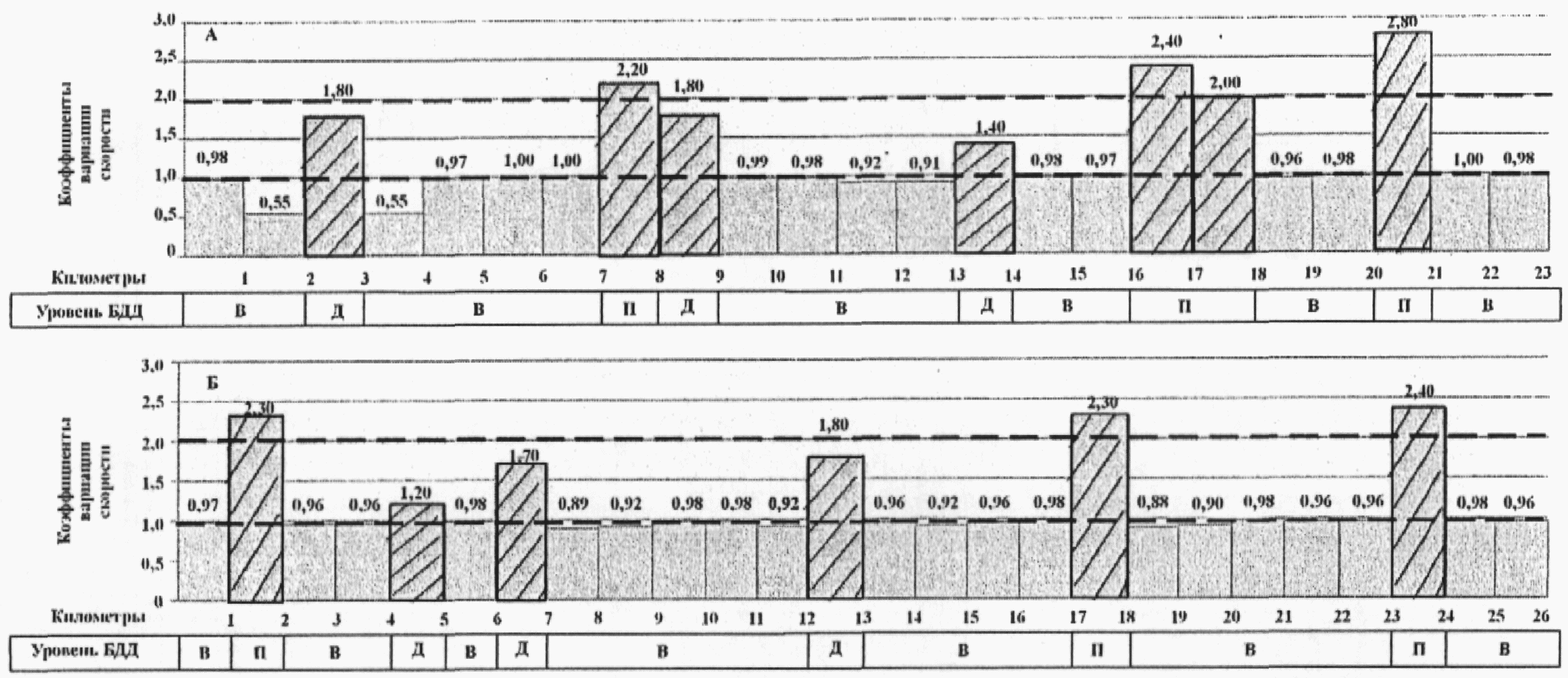 5.1.2 Для оценки безопасности движения по критерию плавности трассы автомобильной дороги строят линейные графики коэффициентов вариации максимальной безопасной скорости.