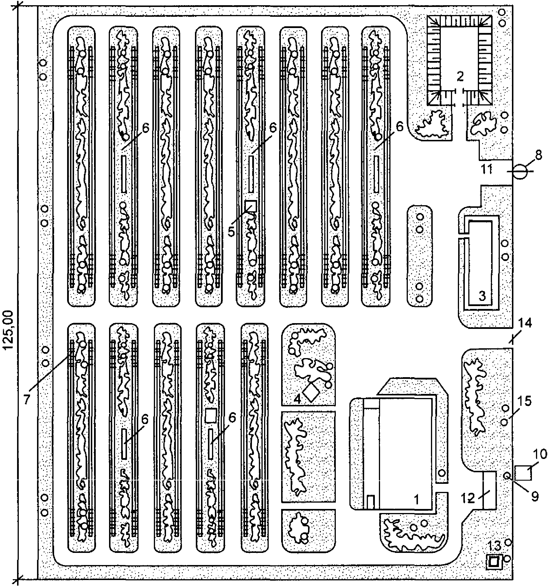 3.3. На генплане с учетом требований противопожарных и строительных норм располагаются пасечные дома, сотохранилища, производственные корпуса, зимовники, складские помещения и другие производственные и вспомогательные сооружения.