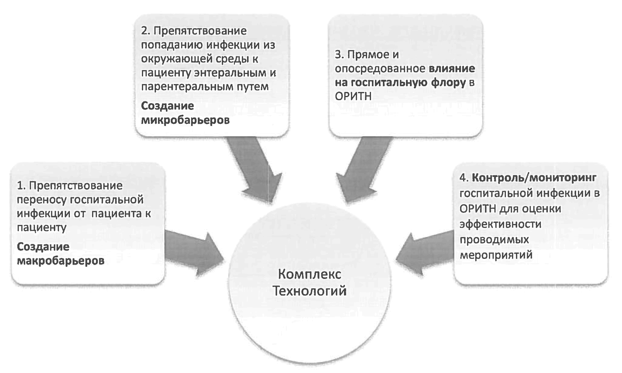 Каждая из представленных на рисунке 1 технологий состоит из стандартных операционных процедур (СОП), подробно изложенных в методическом письме. Решение всего комплекса задач по профилактике госпитальной инфекции в условиях ОРИТН абсолютно необходимо для успешного функционирования как перинатальных центров, так и детских больниц.