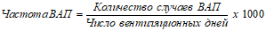 Если в ОРИТН широко используется инвазивная ИВЛ через интубационную трубку, то целесообразно вести дополнительный учет частоты развития вентилятор-ассоциированной пневмонии. Частота вентилятор-ассоциированной пневмонии рассчитывается по формуле: