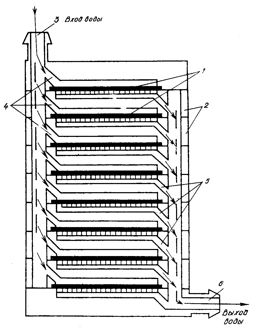 воды, 4 - входные каналы секций, 5 - выходные каналы секций,