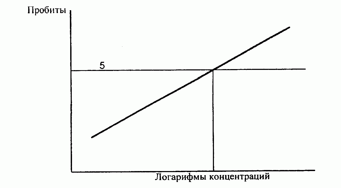 (табл. П 2.1). Через полученные точки проводят прямую по методу наименьших квадратов (линейная интерполяция) с использованием программы Excel или аналогичной. Потом из точки на оси ординат, которая соответствует 5 пробитам (50%), проводят линию, параллельную оси абсцисс, до пересечения с линией графика. Из точки пересечения опускают перпендикуляр на ось абсцисс. Точке пересечения перпендикуляра и оси абсцисс соответствует десятичный логарифм (LC