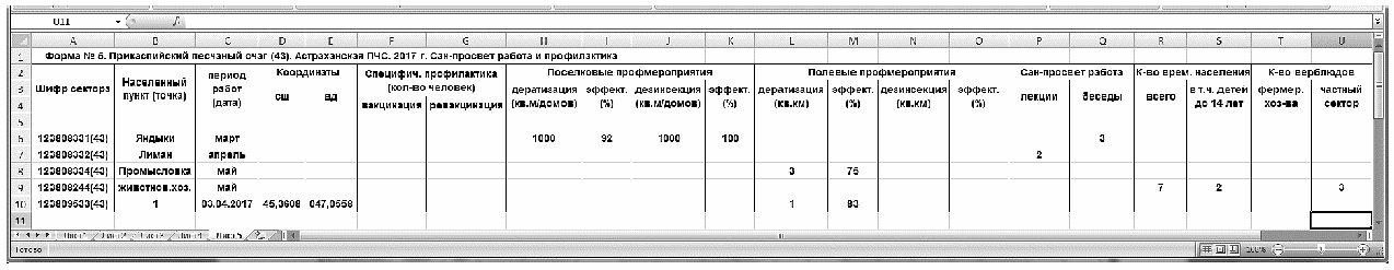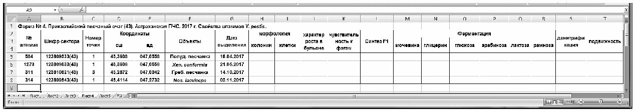 После окончания каждого полугодового или иного тура эпизоотологического обследования в двухнедельный срок все данные заносят в электронные таблицы соответствующих файлов компьютерного приложения Microsoft Excel, которые затем направляют в РосНИПЧИ "Микроб", Противочумный центр и курирующий институт. Основное предназначение табличных форм - передача данных эпизоотологического обследования отдельных пунктов природных очагов чумы в центр накопления информации для последующего формирования геоинформационных баз данных электронных паспортов. В таблицы вносят информацию обо всех добытых видах носителей и переносчиков и собранных объектах окружающей среды, подлежащих лабораторному исследованию.
