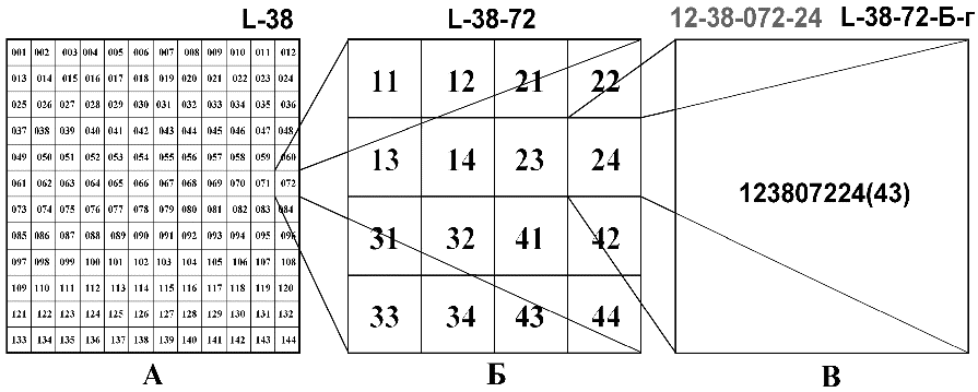 3], касающимися как буквенных обозначений листов, так и их цифровых аналогов (шифров номенклатур). Согласно этим правилам, представленным в "