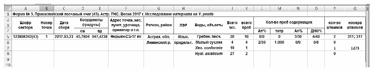 Скриншот 2.3. Фрагмент формы N 3 с гипотетическим содержанием, демонстрирующий вариант представления результатов лабораторного исследования полевого материала для внесения в базу данных электронного паспорта природного очага чумы.