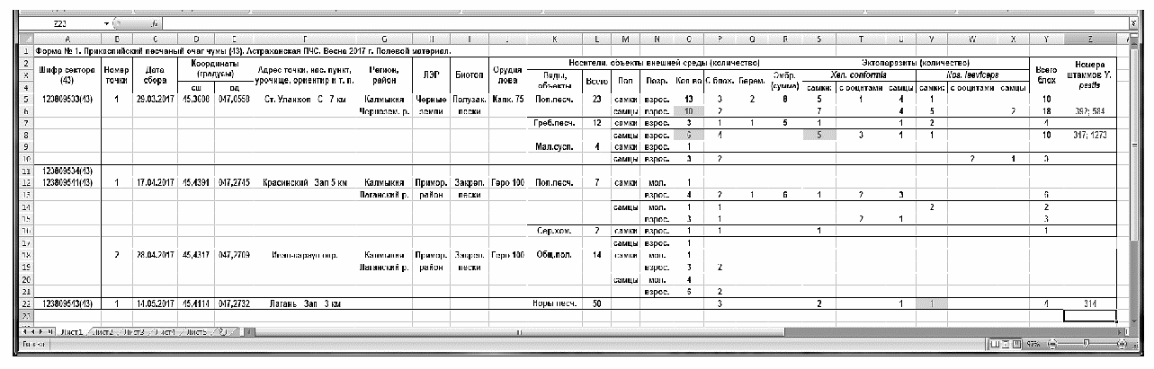 скриншоте 2.1 (прилож. 2). Ширину отдельных столбцов увеличивают до размеров, обеспечивающих удобное размещение необходимого текста и цифровых значений. В первой графе построчно размещают полный список секторов обслуживаемой территории очага в регулярном порядке, учитывая числовую последовательность. В следующих графах указывают номера точек, даты сбора полевого материала, подробную географическую и биоценологическую информацию. Затем приводят данные о количестве добытых животных, дифференцируя их по видам, полу, возрасту, генеративному состоянию и т.д., если эти особенности были определены и зафиксированы при сборе или исследовании материала. Данные об участии самок в размножении (число беременных, эмбрионов, самок с увеличенными ооцитами) обычно устанавливают только для основных, массовых или других важных видов носителей и переносчиков, исключая соответствующие строки или графы для других, менее значимых видов.