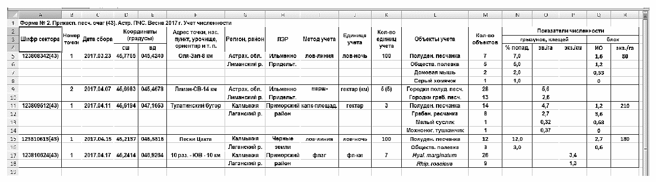 скриншот 2.2). Первые 8 столбцов повторяют сведения из формы N 1, поскольку учет численности животных на некоторых точках может проводиться без сбора полевого материала, а графы с географической информацией и в этом случае необходимы.