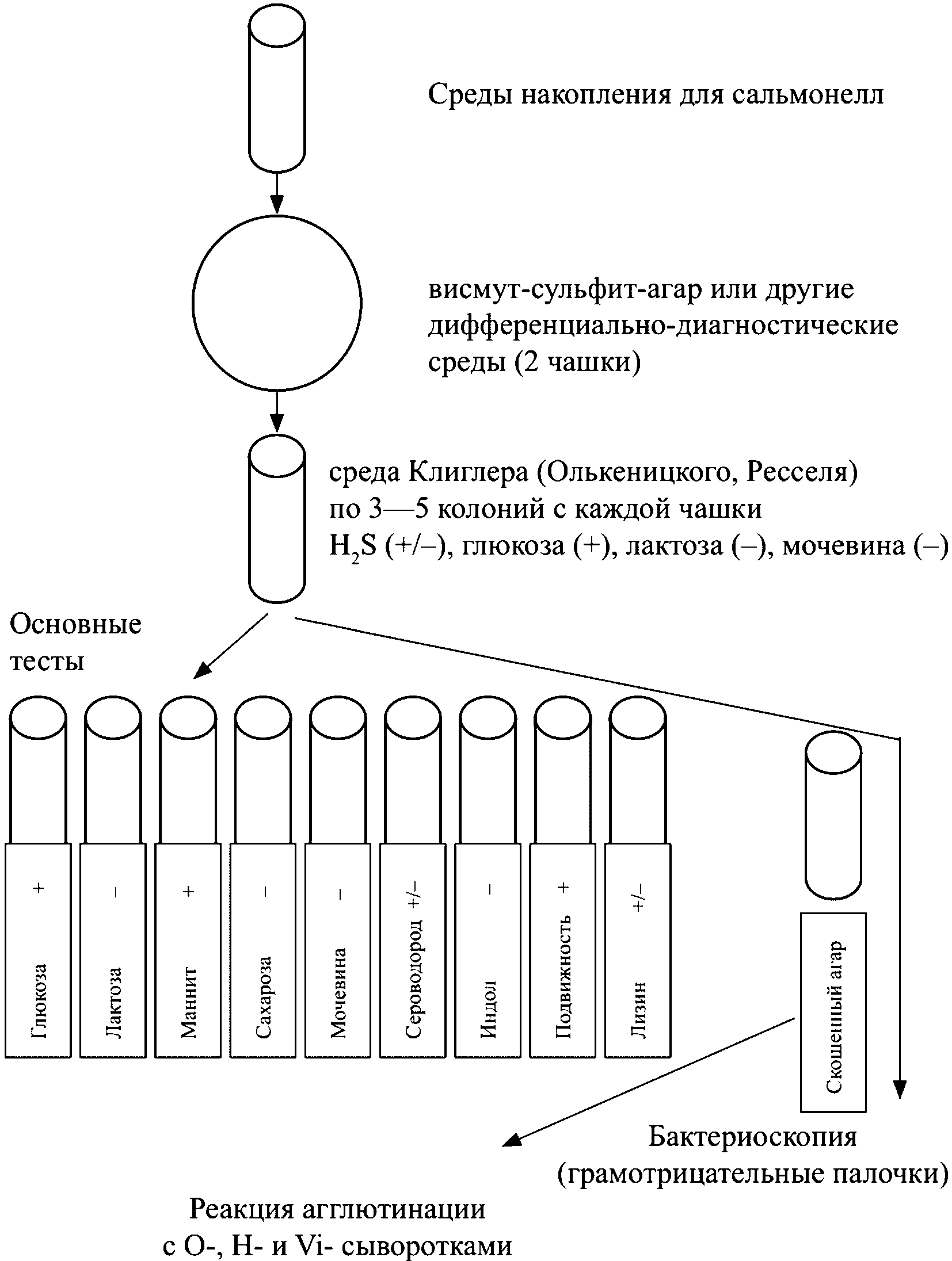 Рост на трехсахарном агаре с сахарозой и маннитом (среде Ресселя II) | Окраска столбика среды | Желтый, газ | Желтый/ Красный | Желтый, почернение по уколу | Желтый, +/- газ | Желтый/ Красный, почернение по уколу |