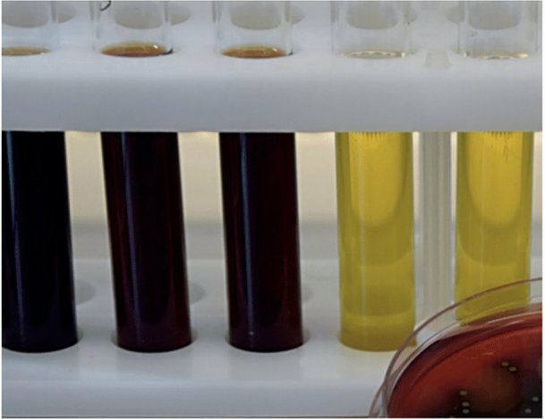 Контрастное изменение цвета среды - колиформы обнаружены | Цвет среды не изменился - отрицательный результат - колиформы и E. coli отсутствуют | Наличие свечения (флюоресценция) в УФ-свете - E. coli обнаружены | Вишнево-красное кольцо - (положительный тест на индол) - E. coli обнаружены |