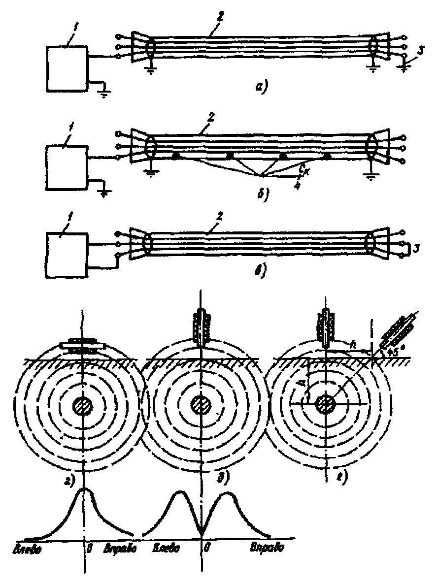 Генератор постоянного, переменного или импульсного тока включается между экранирующей оболочкой и цепями заземления, и оператор должен начинать измерения с точки трассы, заведомо находящейся до места повреждения. С помощью зондов (контактные стержни при использовании генератора постоянного тока, контактные пластины при включении генератора переменного или импульсного тока), разнесенных между собой на расстоянии от 50 до 100 см, оператор производит измерение (гальванометром на постоянном токе, милливольтметром на переменном токе и импульсным вольтметром при импульсном токе) разности потенциалов на поверхности земли, перемещаясь вдоль трассы кабельной линии. До места повреждения стрелки измерительных приборов будут отклоняться в одну сторону, за местом повреждения в другую сторону, а непосредственно в месте повреждения отклонения стрелки от среднего положения не будет. Прибор для определения места повреждения в изолирующей пластмассовой наружной оболочке кабеля разработан во ВНИИЭ.