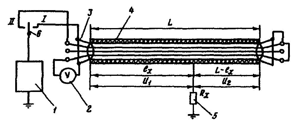 После выполнения всех мер безопасности при работах на кабельных линиях (см. приложение) приступают к определению вида повреждения. С помощью омметра и мегомметра на разземленном кабеле производят измерение сопротивления изоляции между жилами; каждой жилой и оболочкой кабеля. Данными приборами выявляются однофазные и междуфазные повреждения с сопротивлением в месте дефекта от нуля до сотен килоом. При большом сопротивлении часто не удается определить вид повреждения указанными приборами, тогда используют высоковольтную испытательную установку. Поочередно, испытывая все три жилы кабельной линии выпрямленным напряжением постоянного тока относительно оболочки кабеля, выявляют вид дефекта кабеля. Таким способом выявляются повреждения вида: "заплывающий пробой", однофазные и междуфазные, разрывы (растяжки) кабеля, повреждения в концевых воронках.