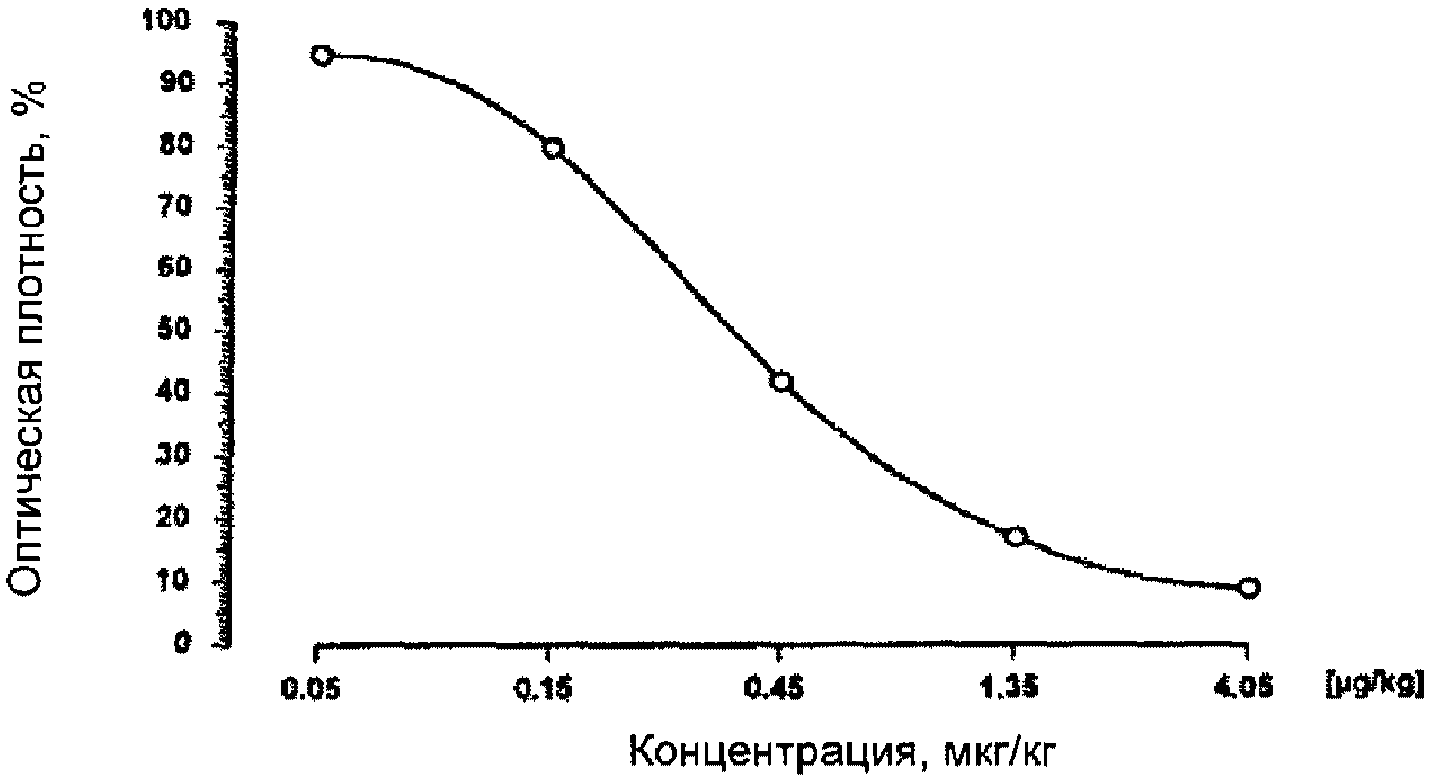 Поставляемый в комплекте набора планшет сенсибилизирован антителами "захвата", специфичными к антителам к левомицетину. Анализ выполняется следующим образом. Исследуемые (стандартные) образцы, препарат, содержащий антитела к левомицетину, и препарат, содержащий конъюгат левомицетина с ферментом, дозируются в лунки активированного планшета. При инкубации планшета в течение определенного времени молекулы левомицетина и молекулы конъюгата левомицетина с ферментом, конкурируя между собой, связываются антителами к левомицетину. В то же самое время при инкубации происходит иммуносорбция этих антител на поверхность лунок планшета за счет их взаимодействия с антителами "захвата" на поверхности.